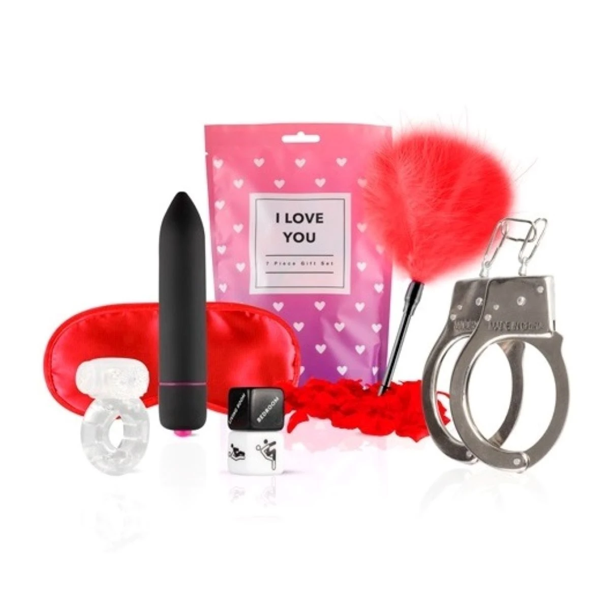 Набор состоит из 7 предметов. В комплект входят : вибромассажер черного цвета, серебристые металлические наручники, пуховка с красными перьями, красная маска на глаза закрытого типа, эрекционнное кольцо с вибрацией белого цвета, красные лепестки роз, игральные кубики.