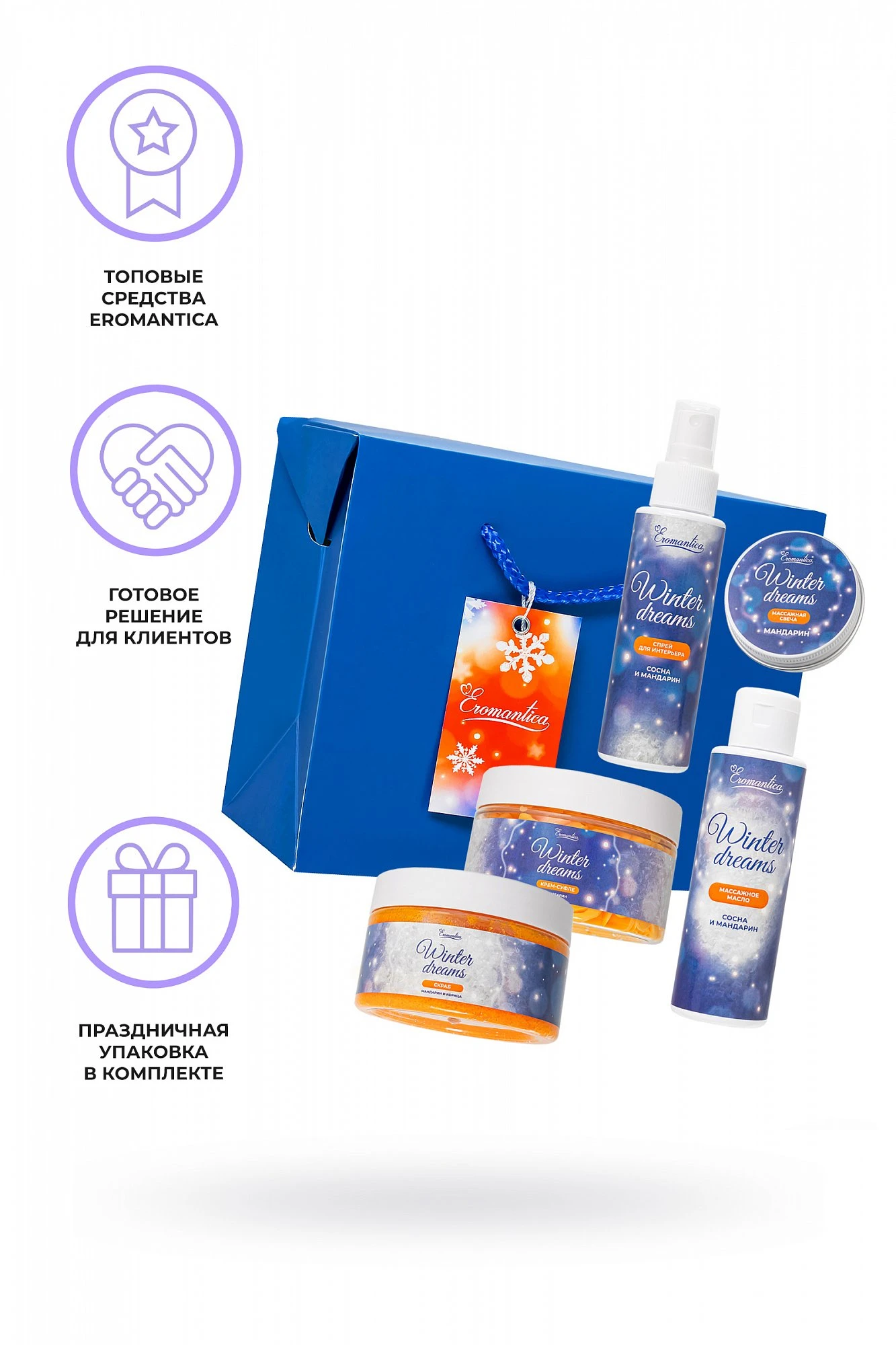 Комплиментарный набор косметики с феромонами, включающий в себя сразу 3 этапа зимнего волшебства: спрей для интерьера с ароматом сосны и мандарина для создания новогодней атмосферы. Средство на водной основе не оставит следов на предметах мебели и интерьера, постельном белье и портьерах. Быстро впитывается и надолго сохраняет хвойно-цитрусовый аромат. Обновляющий сахарный скраб для тела с ароматом корицы и мандарина и тающий крем-суфле для тела с ароматом мандарина для бережной заботы о красоте вашей кожи. Частички сахара деликатно очищают кожу, улучшают кровообращение и стимулируют клеточное обновление. Ценные масла: ши, кокоса, оливы, персика и рапса в составе средств устроят настоящую бьюти-перезагрузку вашему телу, насытят кожу витаминами и минералами, сделают ее поверхность гладкой и шелковистой. Массажное масло с ароматом сосны и мандарина и массажная свеча с ароматом мандарина для теплых чувственных прикосновений и расслабляющего массажа.