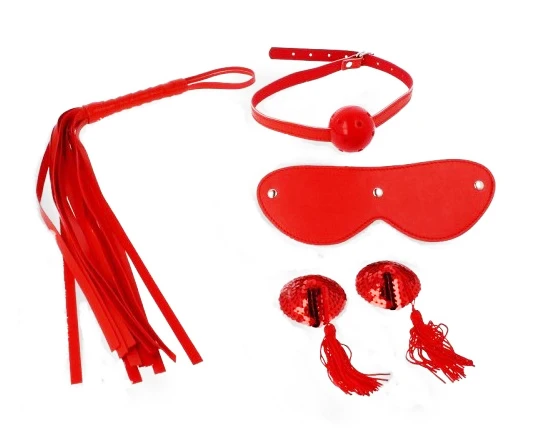 Комплект из 4-х предметов для эротических игр внесет в вашу сексуальную жизнь новые яркие эмоции С этим набором аксессуаров вам некогда будет скучать! В наборе: маска, плеть, кляп, пестисы. Материал: искусственная кожа. Цвет: красный.