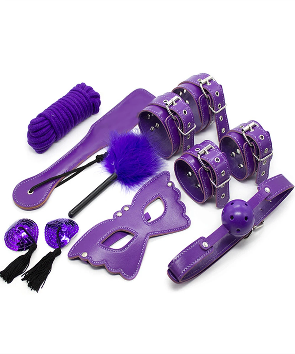 Роскошный комплект для эротических игр внесет в вашу сексуальную жизнь новые яркие эмоции! С этим набором аксессуаров Вам некогда будет скучать! В наборе: наручники, оковы, маска, кляп, шлепалка, щекоталка, верёвка, пестисы. Материал: искусственная кожа. Цвет: фиолетовый.