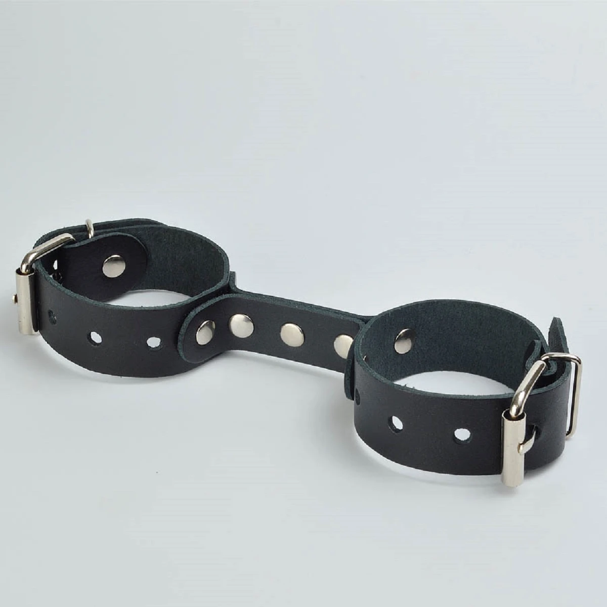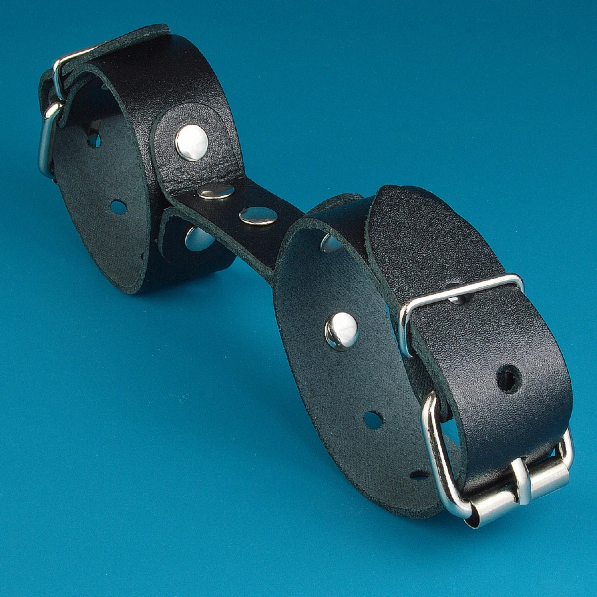 Наручники изготовлены из ременной кожи. Фурнитура никелированная. Максимальный окружность наручников 24 см. Ширина ремешков 2,5 см. Наручники имеют кожаную перемычку, на которой зафиксированы наручники. Цвет черный.