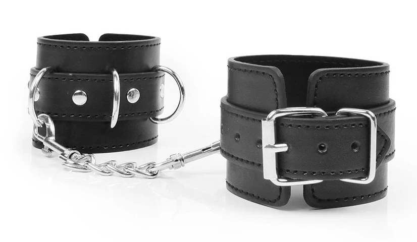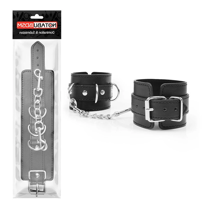 Размер наручников регулируется с помощью ремней. В комплект входит прочная металлическая цепочка, которой при необходимости можно соединить наручники. Внешняя сторона наручников оснащена тремя кольцами, которые можно испольцовать для дополнительной сцепки с другими бондажными приспособлениями.