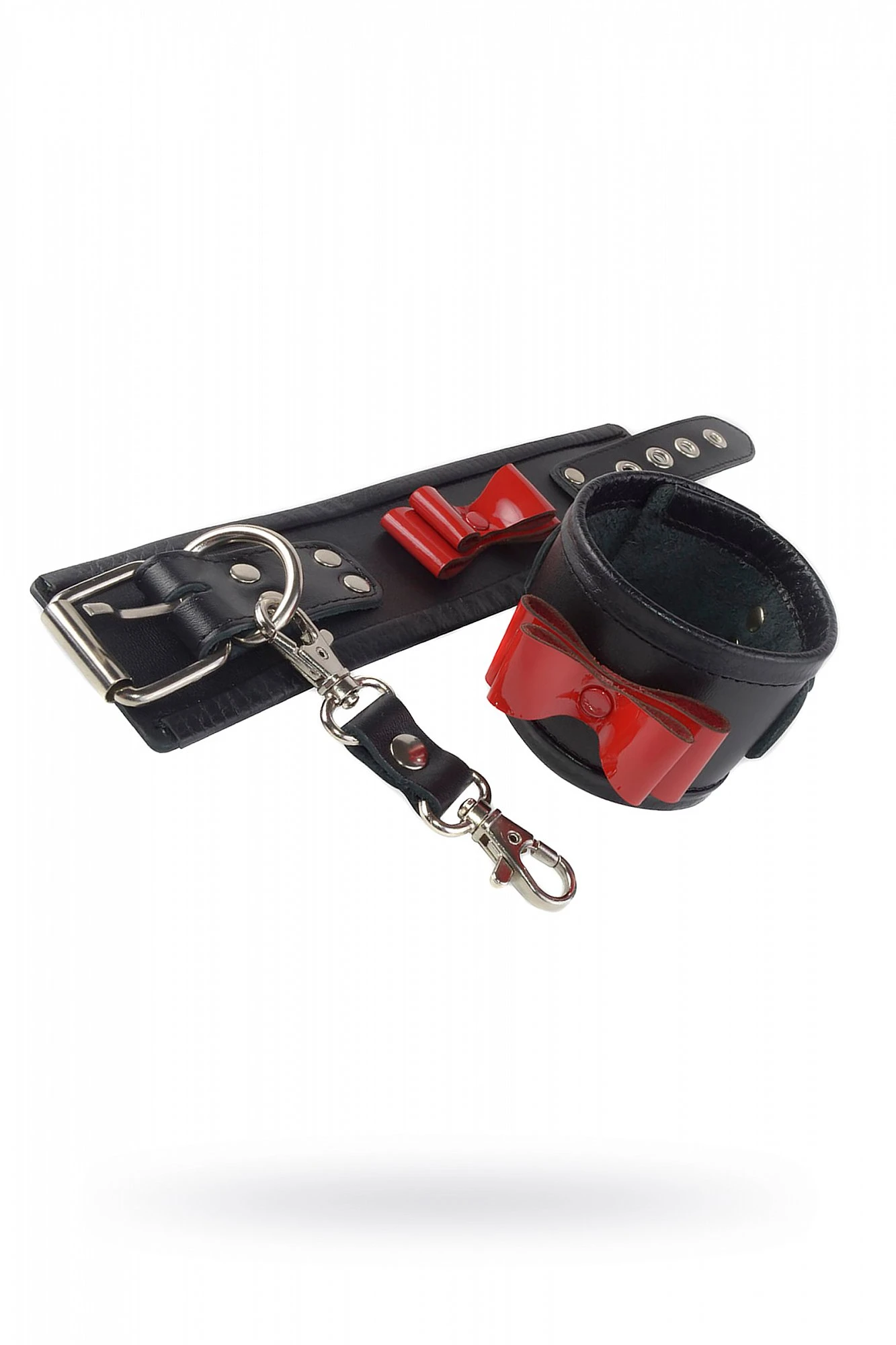 Наручники от Ситабелла – это яркий и эффектный аксессуар ролевых игр, который поможет не только ограничить подвижность вашего секс-партнёра, но и своим видом украсит запястья. Наручники изготовлены из натуральной кожи черного цвета и представляет собой основу черного цвета, поверх которой проходит ремешок выполняющий, как декоративную функцию, так и регулировочно-фиксирующую. Кокетливость и яркость лаконичному изделию придаёт объемный бантик из лаковой кожи красного цвета. Соединить наручники можно при помощи карабинов, скреплённых при помощи небольшой кожаной перемычки. Вся используемая металлическая фурнитура имеет никелевое покрытие.
