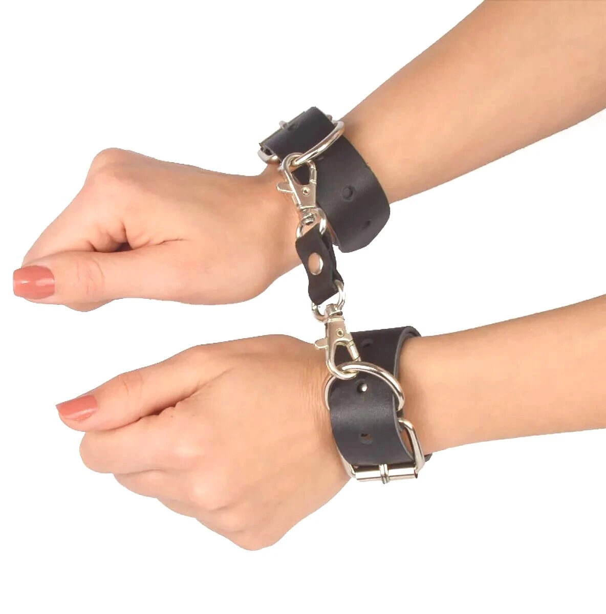 Черные наручники из натуральной кожи от Ситабелла помогут ограничить движения секс-партнёра, достаточно лишь одеть на запястья комфортный, но прочный девайс. Лаконичные, но при этом красивые наручники подойдут для новичков, размер легко регулируется при помощи металлической пряжки. Соединяются наручники при помощи небольших карабинов, скреплённых кожаной перемычкой. Вся металлическая фурнитура имеет никелевое покрытие. Размер: общая длина около 23 см, ширина 2,5 см.