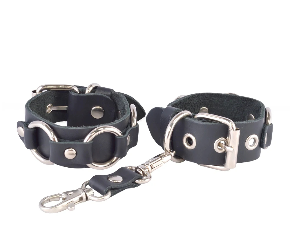 Наручники Sitabella "Властелин Колец" из натуральной кожи не оставят равнодушными любителей поэкспериментировать и позволят доминанту почувствовать истинную власть над партнером. Стиль задают черный цвет в сочетании с мелаллической фурнитурой, украшены кольцами и клепками. Пряжка поможет комфортно зафиксировать наручники на запястьях. Лаконичные, но при этом красивые наручники подойдут, как для женщин, так и для мужчин, . Соединяются наручники при помощи небольших карабинов, скреплённых кожаной перемычкой. Вся металлическая фурнитура имеет никелевое покрытие. Размер: общая длина наручника около 25 см, ширина ремешка 2,5 см. Цвет черный.