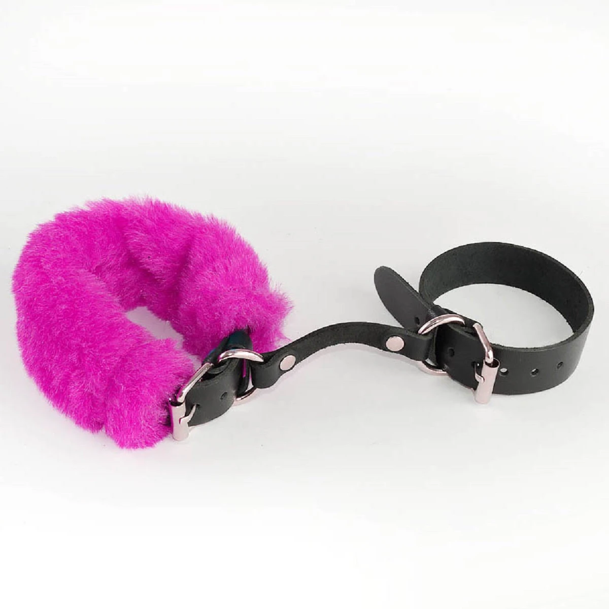 Черные наручники из натуральной кожи декорированы съемным розовым искусственным мехом от Ситабелла помогут ограничить движения секс-партнёра, достаточно лишь одеть на запястья комфортный, но прочный девайс. Лаконичные, но при этом красивые наручники подойдут для новичков, размер легко регулируется при помощи металлической пряжки. Соединяются наручники кожаной перемычкой. Вся металлическая фурнитура имеет никелевое покрытие. Размер: общая длина около 65 см, ширина 3,5 см.