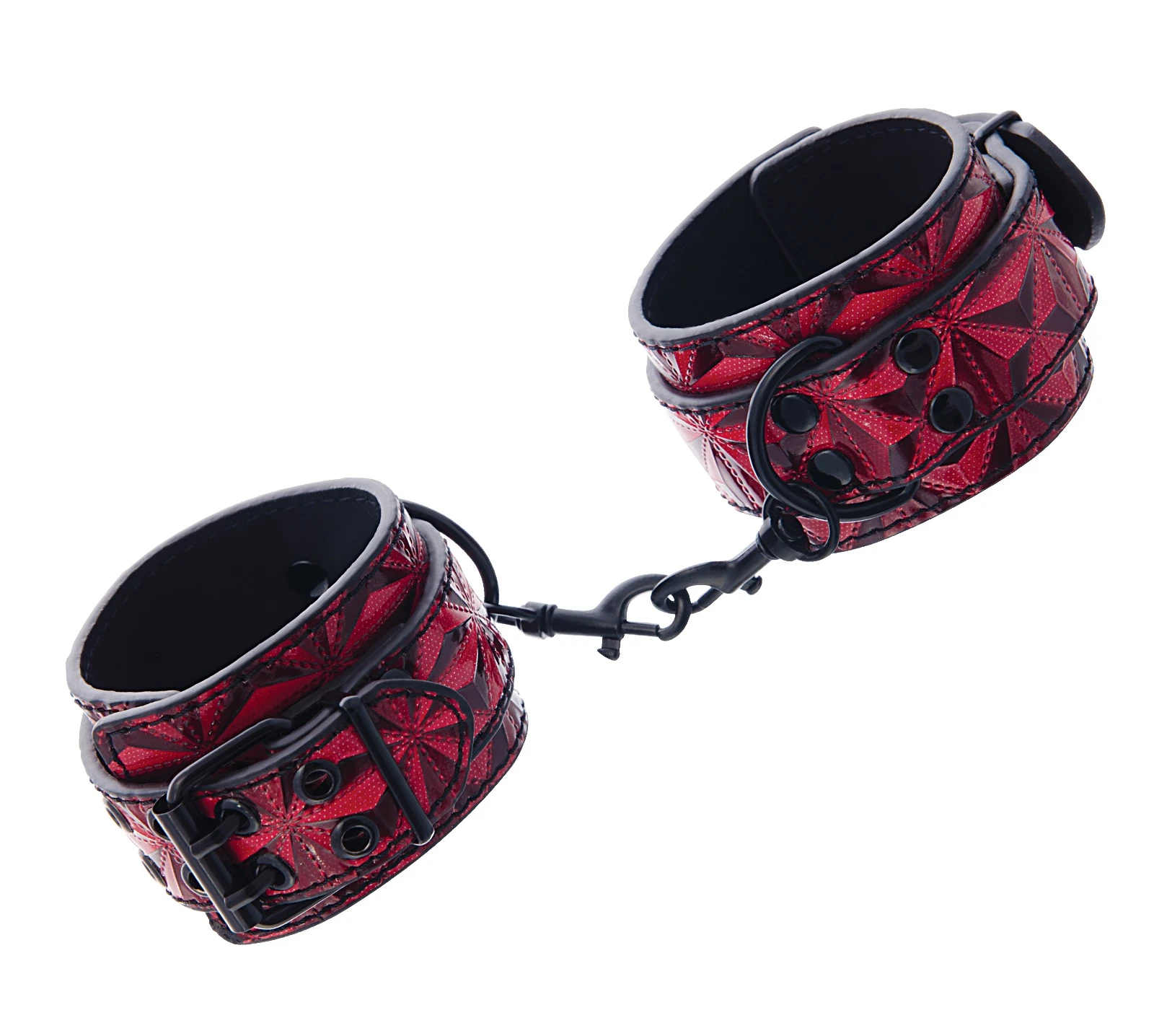 Наручники изготовлены из комбинированного материала, а именно искусственной кожи и винила, соединительная цепочка и дополнительные фиксирующие приспособления из металла. Главная сторона имеет яркую отделку узором, похожим на грани драгоценного камня, которые при поподании света переливаются, благодаря лаковому напылению. Разиер: ширина ручной манжеты 5,5 см, длина 30 см, регулировочный ремень с застежкой имеет ширину 2,5 см и длину около 36,5 см. Длина цепочки между манжетами, включая карабин 16 см. Цвет красный.