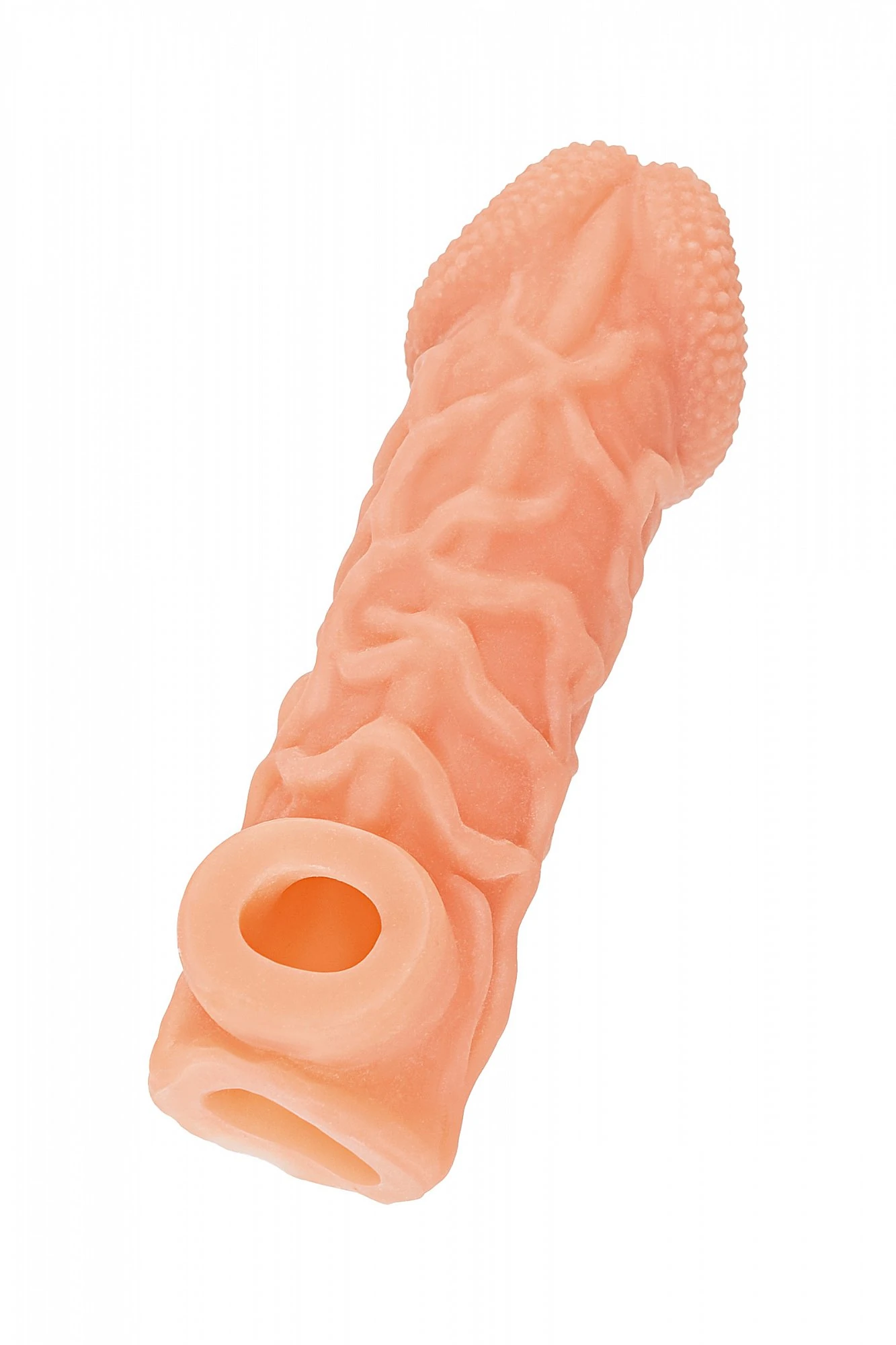 Увеличивающая насадка с фантазийным рельефом в виде вен и пупырышек от Kokos открывает новые возможности для взаимного удовольствия. Увеличение продолжительности полового акта у мужчины - задержка эякуляции, и наращивание темпа приближения оргазма у женщины. Насадка придает дополнительный объем и длину половому члену. Мощная головка имеет рельеф из мелких пузырьков и крупный выступ. Очень хорошо стимулирует зону G и вход во влагалище благодаря значительному размеру. Особенный рельеф в виде многочисленных вен по всему стволу насадки деликатно ласкает чувствительные зоны. Размер: длина 15,6 см, диаметр 4,2 см. Цвет телесный. Для более комфортного использования рекомендуем приобрести смазку на водной основе и очищающий спрей Clear Toy 100 мл для обработки изделия.