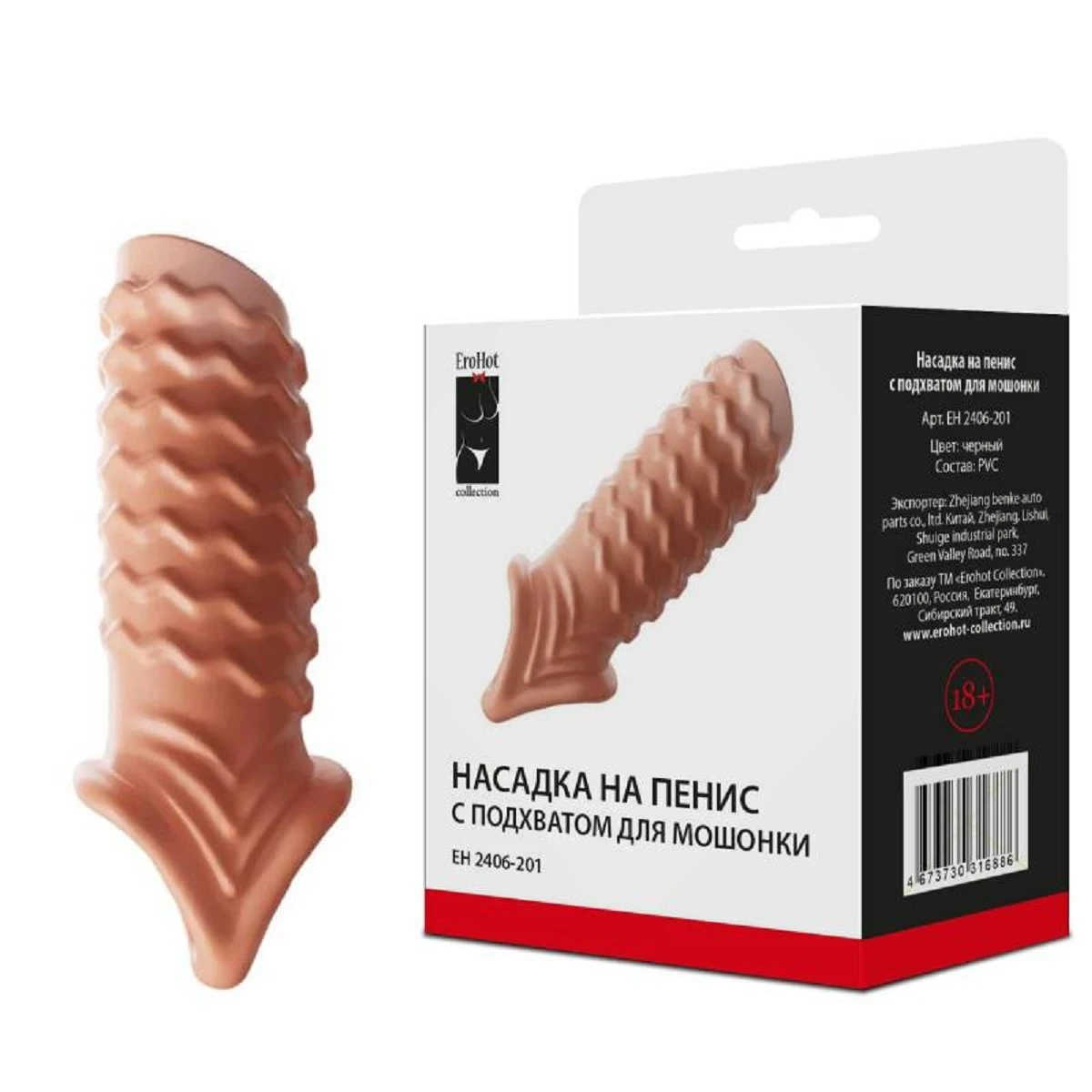 Насадка с подхватом для мошонки предназначена для увеличения обхвата пениса, ограничения притока крови к пенису, увеличения сексуального времени, увеличения Вашего собственного удовольствия и удовлетворения Вашей партнерши. Дополнительная стимуляция в виде волнистой поверхности. Кольцо насадки эластичное. Оно плотное, но удобное при использовании и подойдет большинству. Изготовлена из силикона, приятна для кожи, безопасна для тела и не имеет запаха. Размер: длина общая 10,5 см, рабочая длина 7,5 см, диаметр 3,3 см. Цвет телесный. Для более комфортного использования рекомендуем приобрести смазку на водной основе и очищающий спрей Clear Toy 100 мл для обработки изделия.