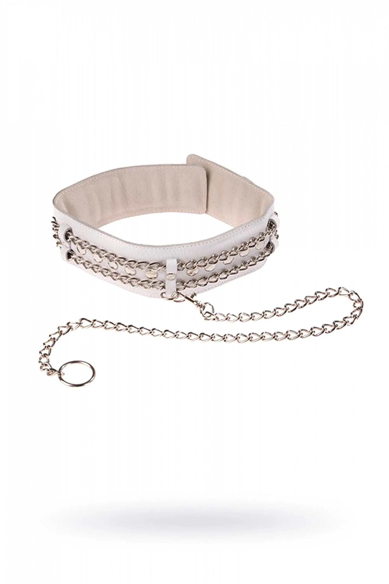 Изготовлен из натуральной кожи с велюровой подкладой. При изготовлении использована никелированная фурнитура. Ширина ошейника 5 см, длина цепочки поводка с карабином 50 см. Размер универсальный.