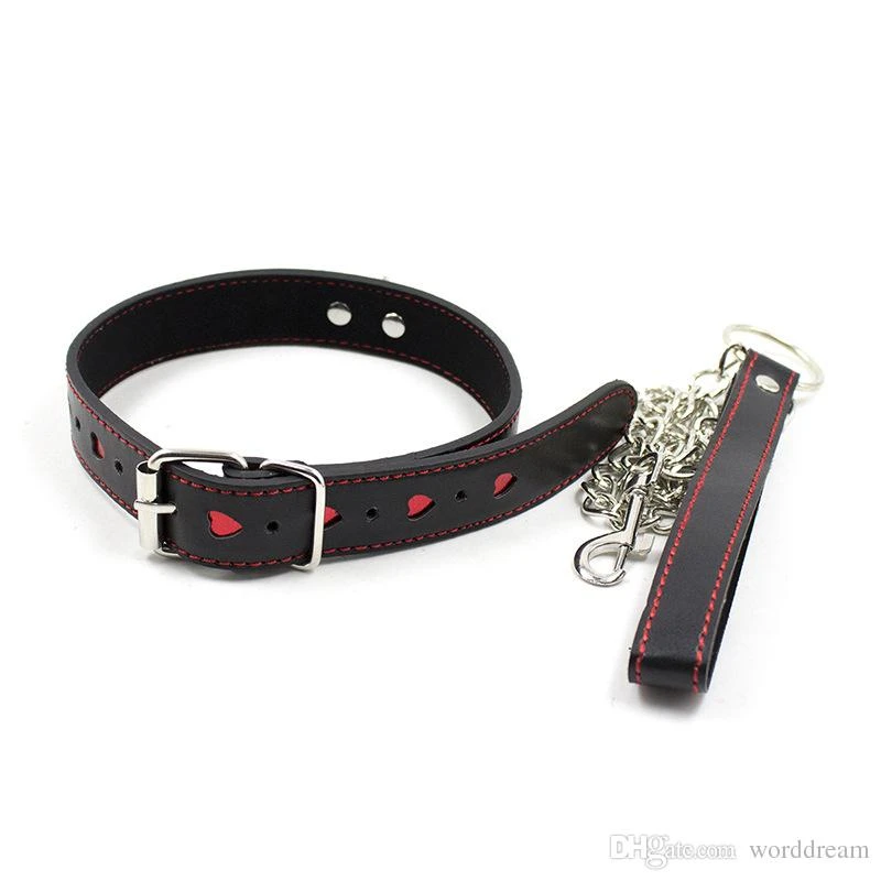 Узкий ошейник из искусственной кожи украшенный красными сердцами может использоваться как стильное украшение или подарок послушной рабе. В комплекте поводок-цепочка с темляком. Материал: искусственная кожа. Размер: длина ошейника 48 см, ширина 2,5 см, длина поводка-цепочки 58 см.