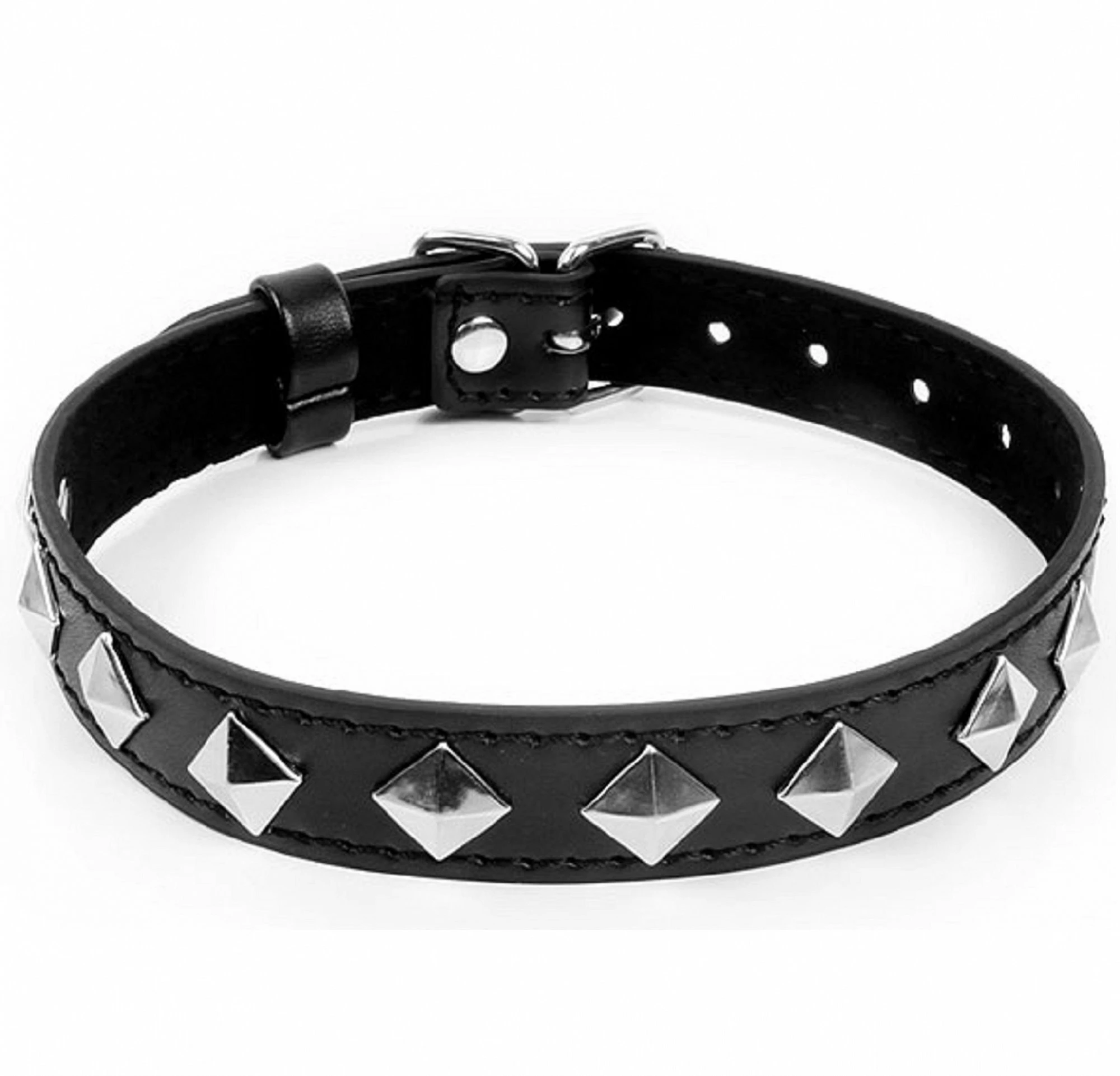 Оригинальный ошейник для любителей БДСМ-игр, декорированный металлическими украшениями. Имеет возможность регулировки размера с помощью ремешков.