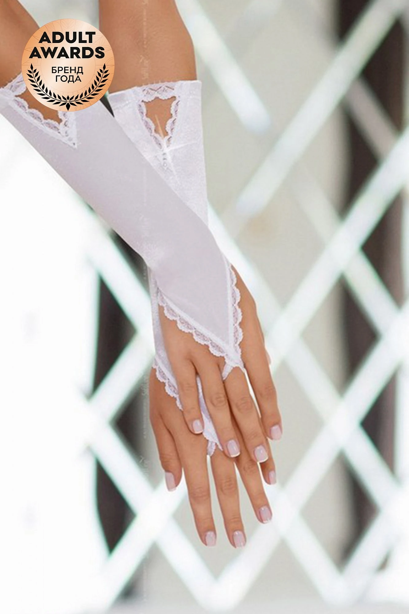 Перчатки атласные, украшенные стразами и кружевными элементами декора. Вырезы в виде треугольников у основания. Материал: 97% полиэстер, 3% спандекс. Размер: S / L.