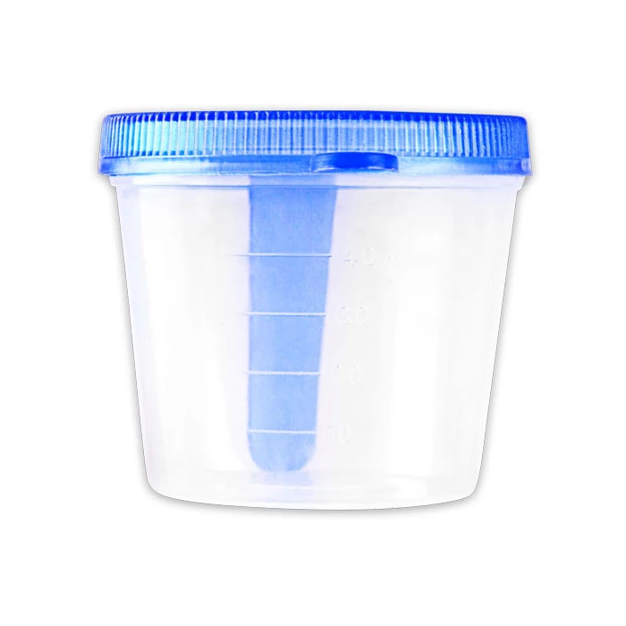 Прозрачный пластиковый контейнер для сбора анализов с синей крышкой. Емкость 40 мл, Баночку можно подписать.