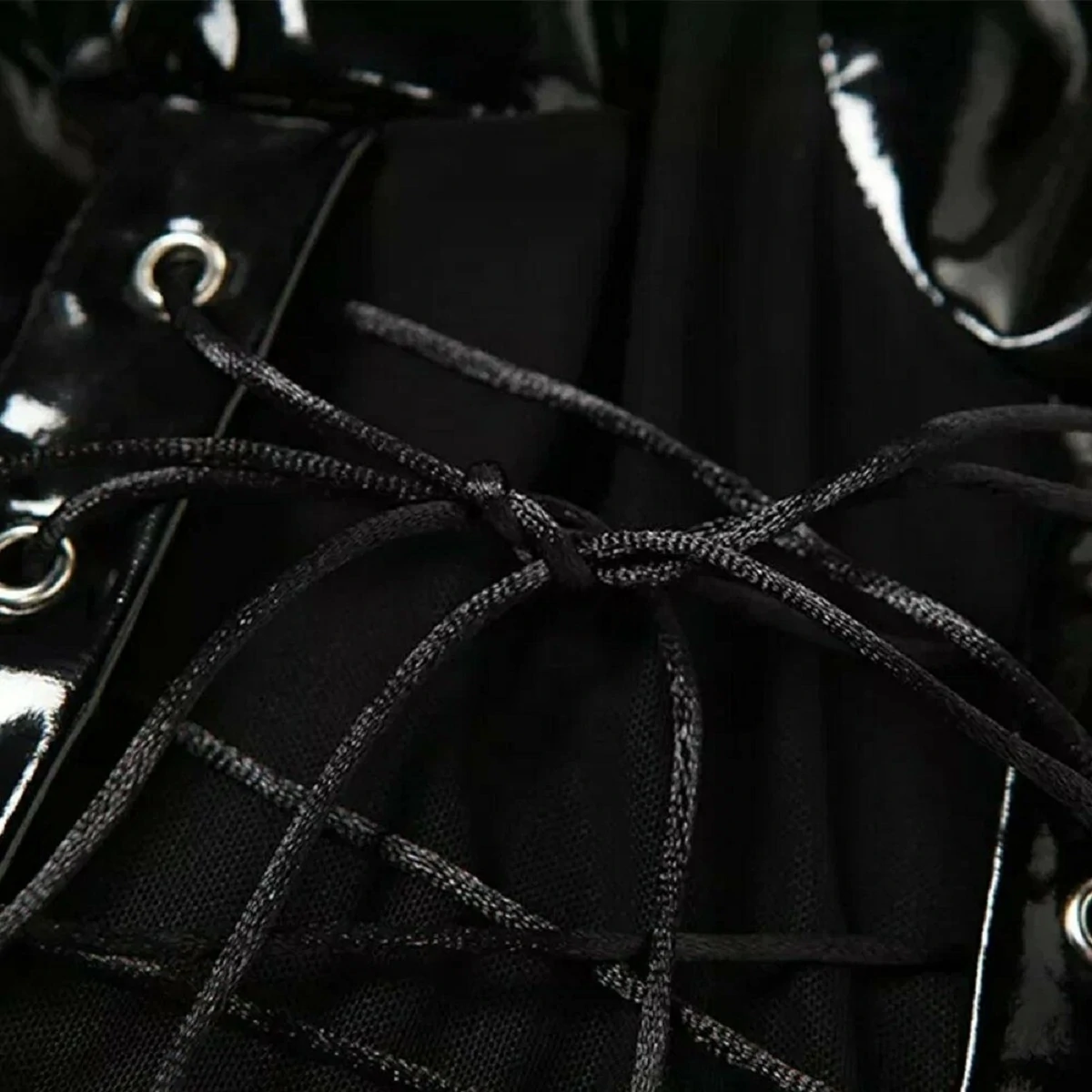 Элегантное эластичное платье из ткани с эффектом wetlook, с прозрачной вставкой и шнуровкой на бретелях это идеальный выбор для тех, кто хочет выглядеть сексуально и соблазнительно. Отлично садится по фигуре. Ткань плотно обтягивает ягодицы, придавая им прекрасную форму и подчеркивая их аппетитность. Цвет черный. Размер M.