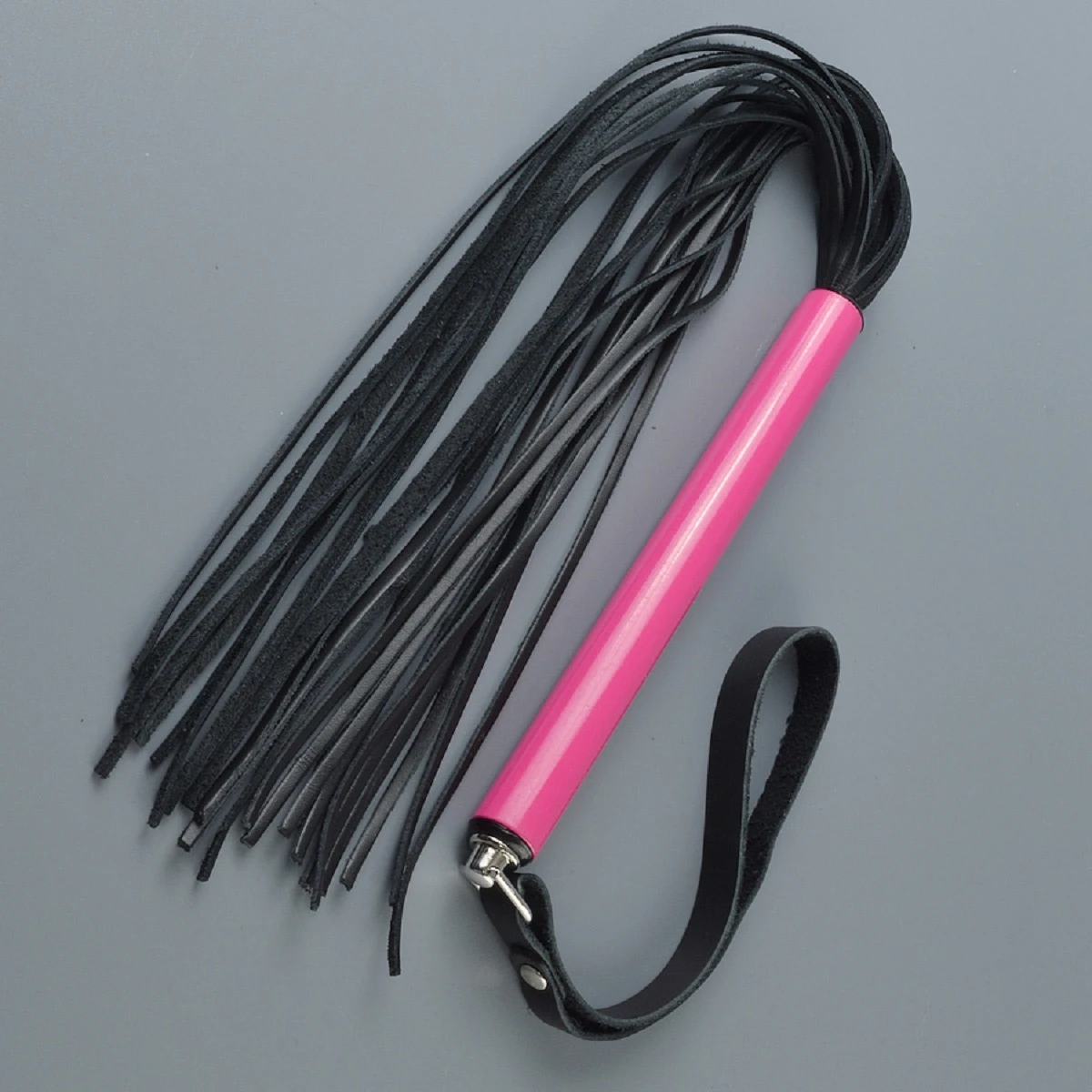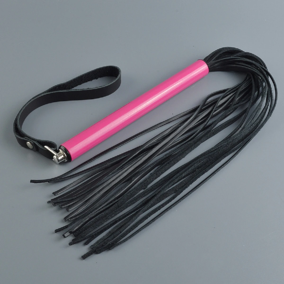 Небольшая плеть с хвостом из тонких 3-х мм лент натуральной кожи. Металлическая рукоять розового цвета цилиндрической формы имеет диаметр 1,6 см, длину – 15 см. Общая длина изделия, без ремешка, 47 см. Цвет хвоста черный.