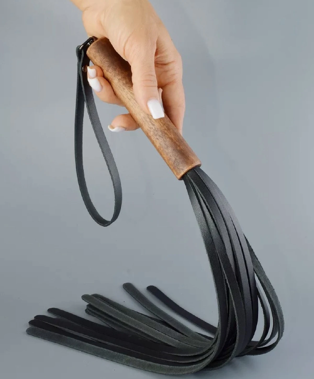 Классическая чёрная плеть – это один из основных атрибутов ролевых игр, при помощи которого, можно и поощрить, поглаживая, и наказать, более сильными ударами, и просто разогреть тело, для обострения тактильной и эмоциональной чувственности. Плеть серии Эко состоит из деревянной рукояти и ударной части, плоские ленты из натуральной кожи черного цвета. Размер: общая длина изделия около 58 см, длина рукояти 14 см, длина плетей 44 см, ширина лент 1 см.