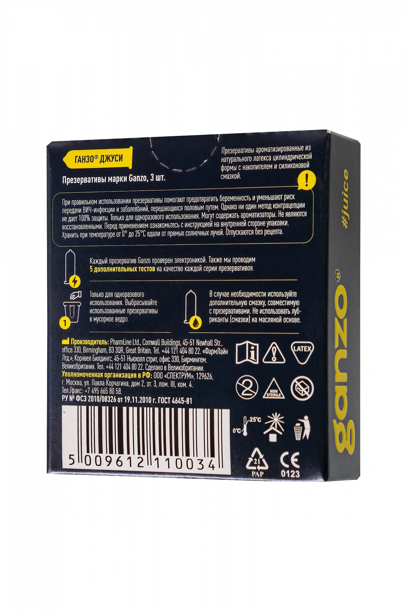 Презервативы Ganzo Juice -это премиальное качество натурального латекса, обильная смазка, комфортное прилегание, различные цвета и ароматы – сделают твой интимный контакт ароматно-цветным путешествием! Желтый – и ты в ванильном облаке, черный – ежевичное настроение, красный – полный тутти-фрутти. Зажгите пламя страсти с презервативы Ganzo Juice! Фруктовые презервативы Ganzo Juice - это яркость, активность и вкусное разнообразие. Хотите разнообразить ваши отношения? Презервативы Ганзо Джус внесут фруктовую нотку. Размер: длина 18 см, диаметр 5,2 см, толщина стенки презерватива 0,06 мм. В упаковке 3 шт.