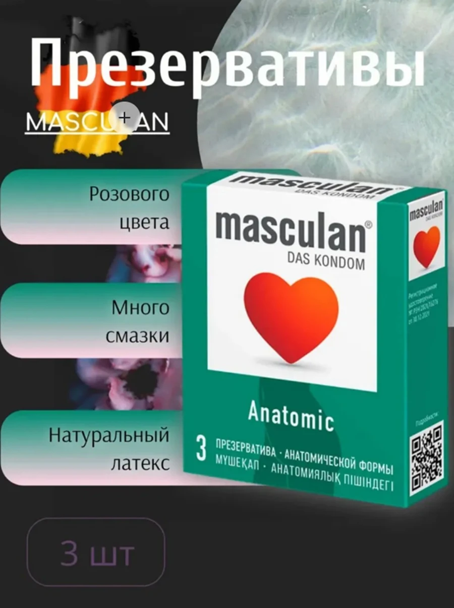 Индивидуальный подход от Masculan к анатомическим особенностям каждого мужчины достигается благодаря презервативам Masculan Anatomic. Это облегающие анатомической формы презервативы с накопителем и особой канавкой, которая позволяет им наилучшим образом адаптироваться к форме полового члена. Нежно-розовый презерватив с легким приятным ароматом и обильным количеством смазки сделает любовный контакт максимально естественным и безопасным. Они обеспечивают максимально естественные и острые ощущения во время интимной близости, при этом сохраняя высокую надежность и безопасность. Masculan – это презервативы премиум-класса, разработанные в Германии с соблюдением высочайших стандартов качества и дизайна. Немецкое производство, высококачественное сырье, и электронное 6-ти ступенчатое тестирование каждого презерватива обеспечивают безопасность и надежность. Размер: длина 19 см, диаметр 5,3 см. В упаковке 3 шт.