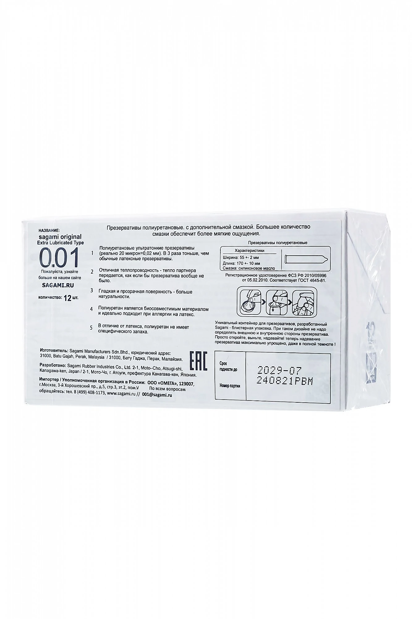 Новая серия полиуретановых презервативов Sagami Original 001 с увеличенным количеством смазки - Extra Lubricated. Созданы специально для любителей полиуретановых презервативов Sagami, которым, по той или иной причине, не хватает смазки во время использования. Эволюционное продолжение линейки самых тонких в мире полиуретановых презервативов Sagami Original. Еще больше мягких и естественных ощущений. Ничего лишнего! Толщина достигает 10 микрон (измерено по стандартам Sagami). Такая толщина достигнута благодаря возможностям полиуретана и постоянному совершенствованию технологий компании Sagami.