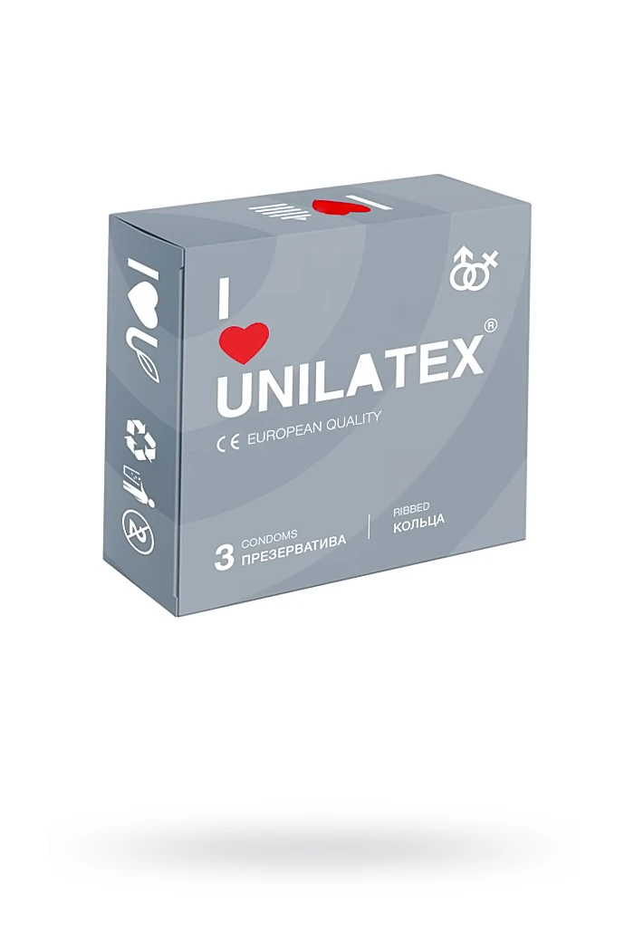 Unilatex Ribbed - поверхность с кольцами. Презервативы из натурального латекса телесного цвета, рифленойповерхностью, покрыты силиконовой смазкой с нейтральным ароматом.Размер: длина 19 см, диаметр 5, 4 см, толщина стенки 0,06 мм. В упаковке 3 шт.