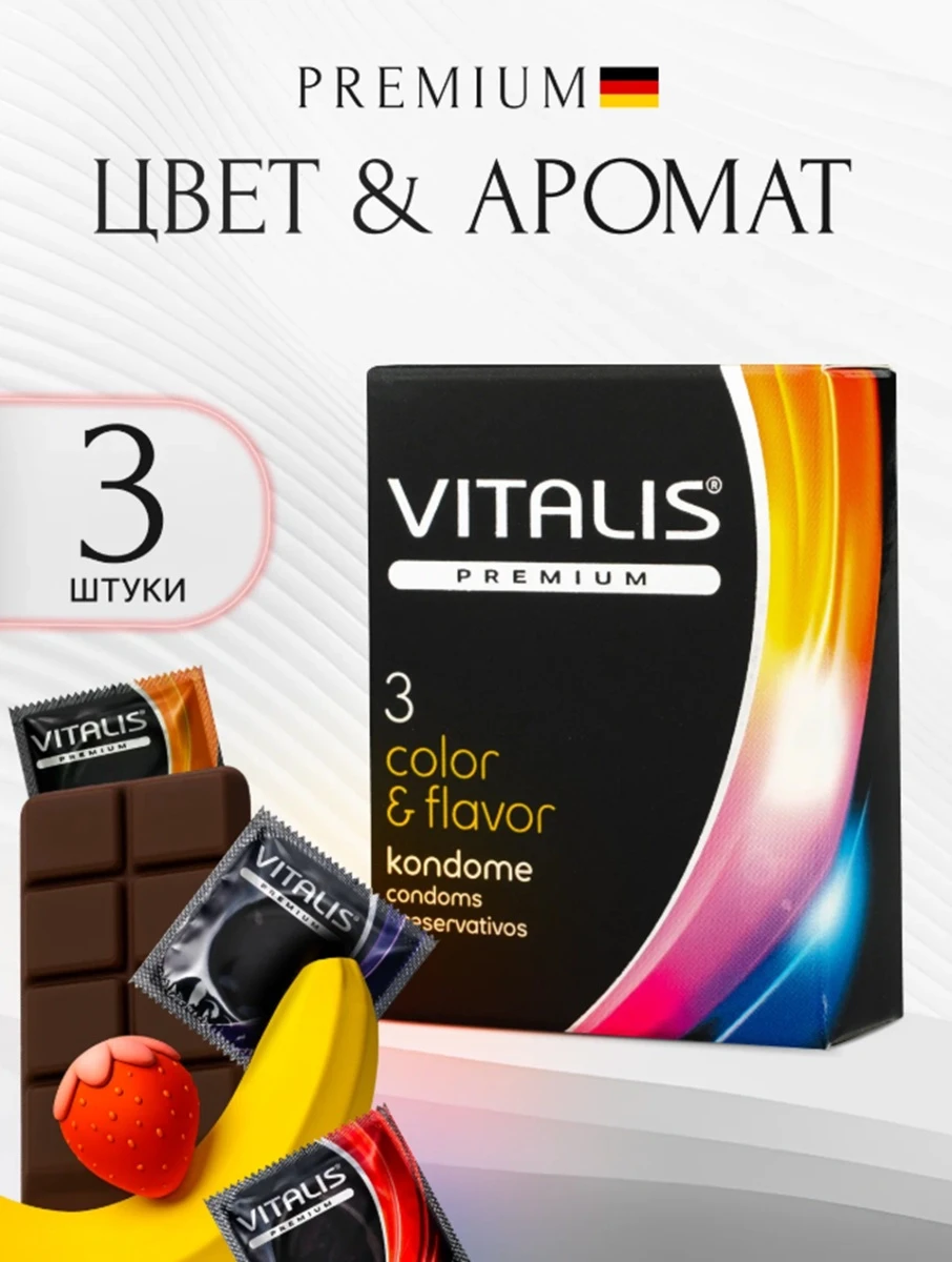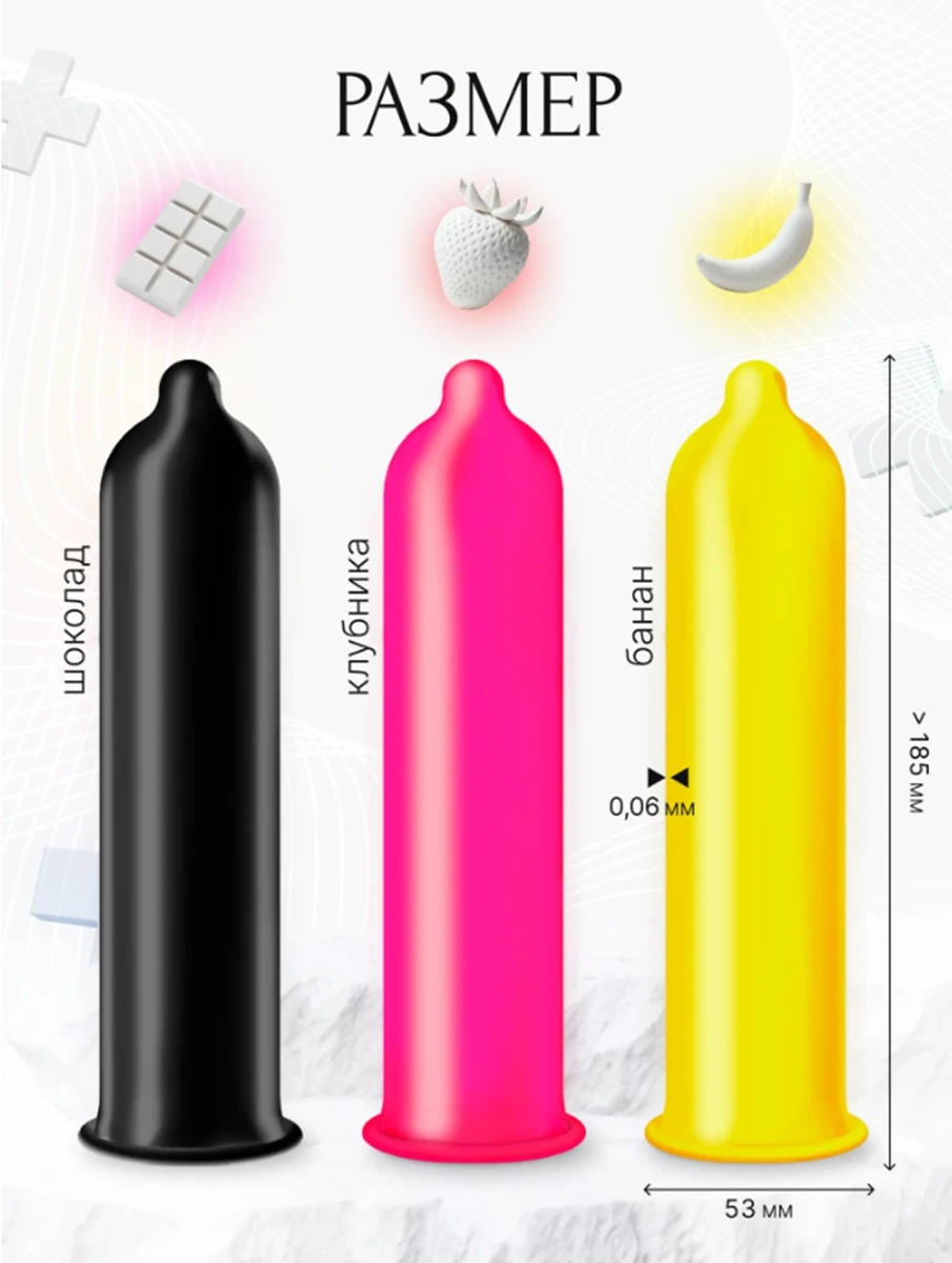 Презервативы различных цветов и ароматов внесут разнообразие в любовную жизнь. Презерватив из натурального каучукового латекса, цветной, с ароматом, смазкой и накопителем. Фиолетовый - с ароматом шоколада, оранжевый - со ароматом банана и красный - с ароматом клубники. Дайте волю своей фантазии! Размер: ширина 5,3 см длина 18 см толщина стенки 0.07 мм Смазка: силикон. Форма: цилиндрическая. Качество: ISO 4074:2002 В упаковке 3 шт.
