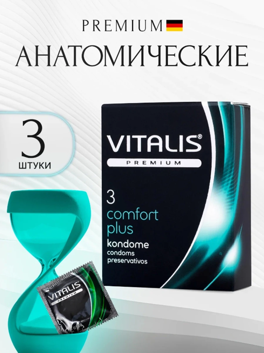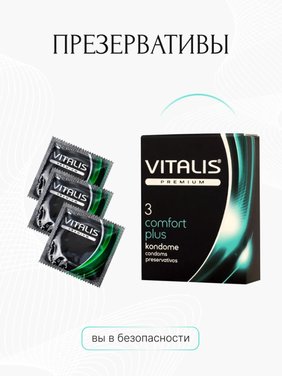 Vitalis Comfort Plus – презерватив из натурального каучукового латекса, с силиконовой смазкой и накопителем. Контурная форма презерватива, с расширением в области головки полового члена обеспечит комфортные ощущения и максимальную защищенность. Так же Вы можете полагаться на надежную защиту, которую обеспечат презервативы Vitalis Comfort Plus. Размер: длина 18 см, диаметр 5,3 см, толщина стенки 0.07 мм. Смазка силикон. В упаковке 3 презерватива.