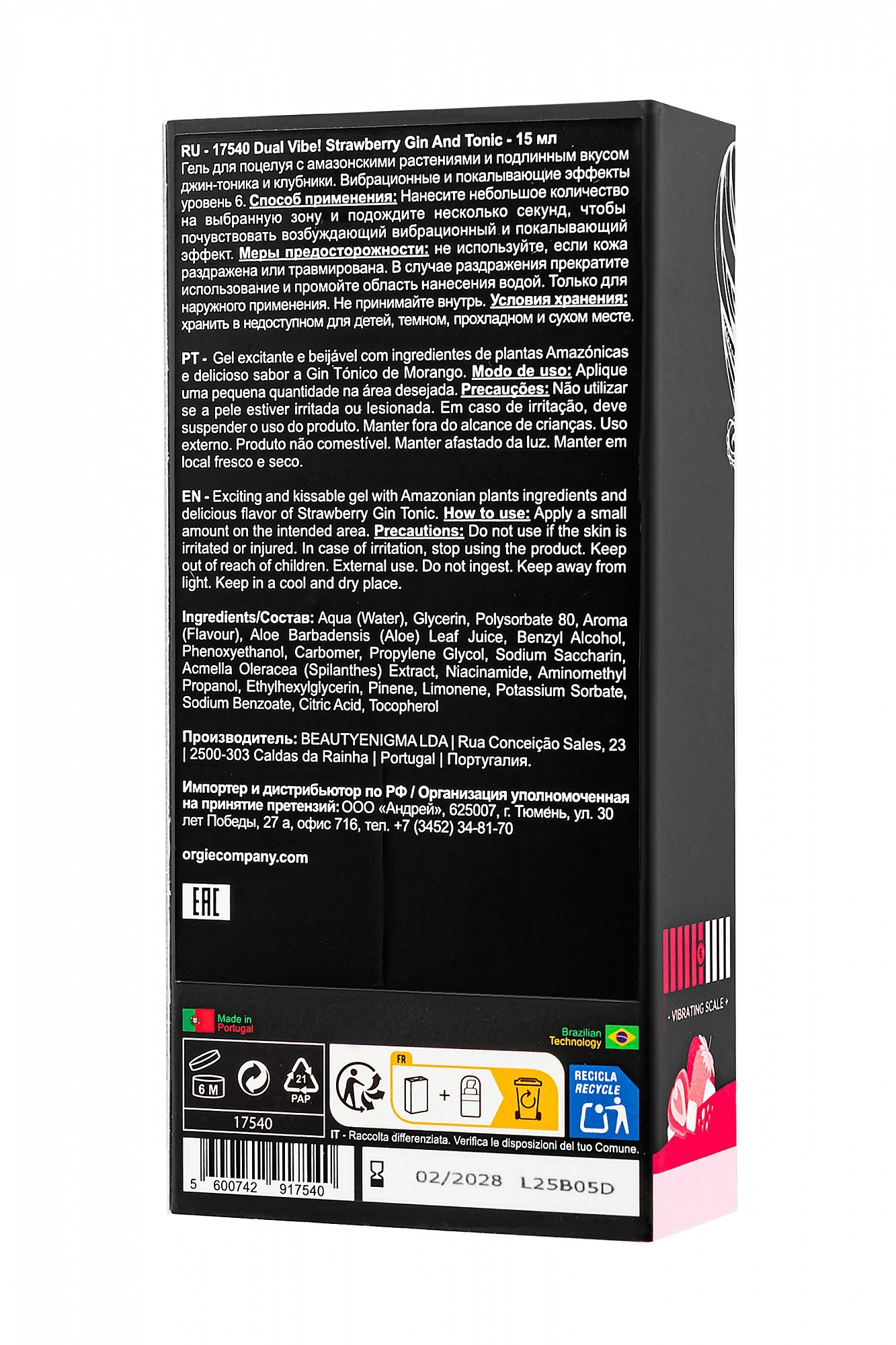 Strawberry Gin And Tonic - жидким вибратором для поцелуев, который привносит нотку изысканности в ваши интимные моменты. Насладитесь интенсивной вибрацией, которая дополнительно усилит ощущения ваших поцелуев и орального секса. Уникальная формула с тщательно продуманным вкусом коктейля Strawberry Gin And Tonic стимулирует ваши вкусовые рецепторы, добавляя ваши интимные моменты неповторимый эффект. Dual Vibe! Strawberry Gin And Tonic - это не просто жидкий вибратор, это возможность усилить близость в вашей паре или нежность к себе. Способ применения: нанесите небольшое количество на интимную зону и наслаждайтесь мгновенным возбуждающим эффектом. Начните с одного нажатия, и почувствуйте, как Strawberry Gin And Tonic подарит вам неповторимые ощущения. Настройте дозировку в соответствии с вашими предпочтениями, чтобы достичь максимального комфорта и удовольствия.