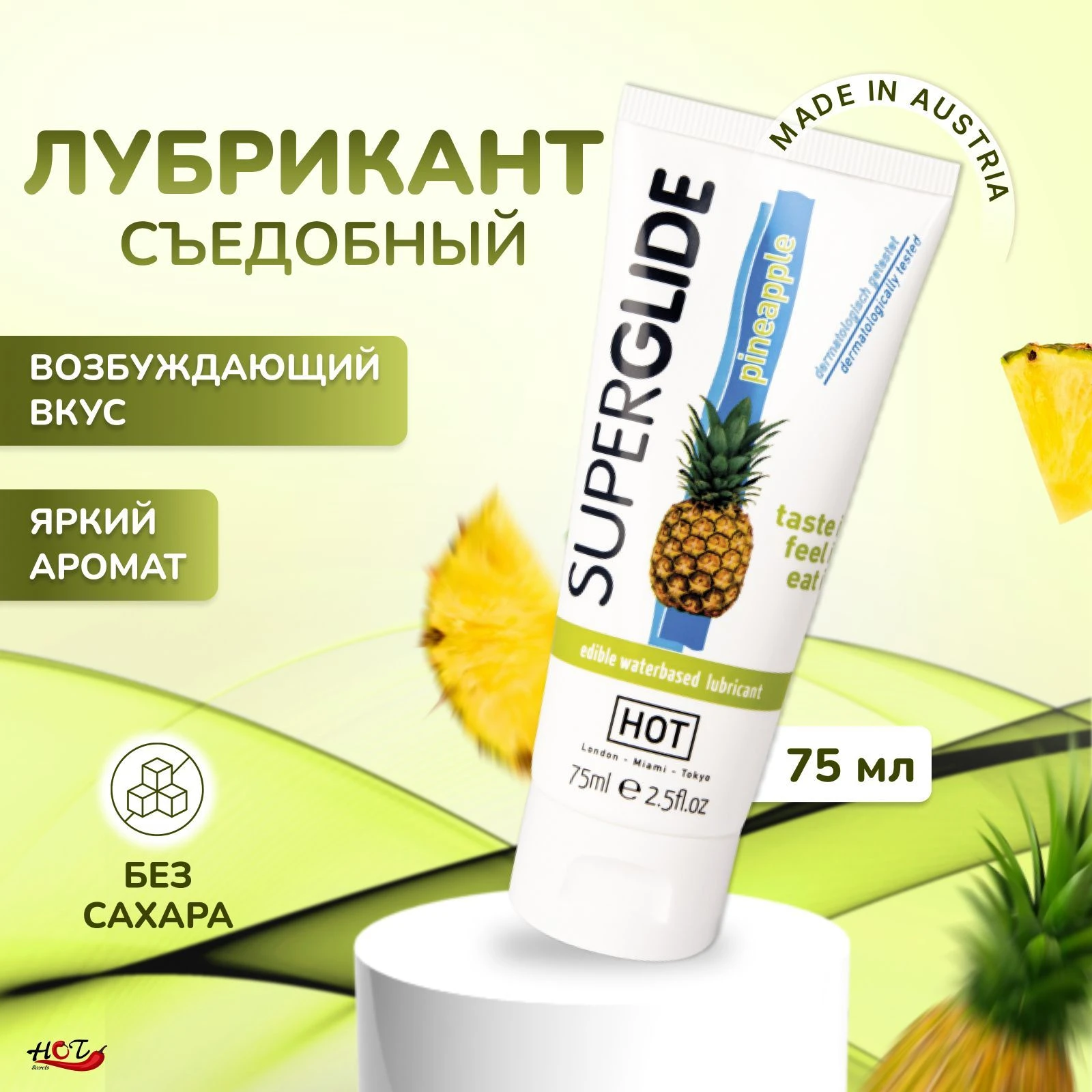 Съедобный лубрикант с ароматом и вкусом ананаса, на водной основе. Идеально подходит для использования с латексными изделиями. Ощутите и попробуйте его! Объем: 75 мл. Прошел дерматологические тестирования.