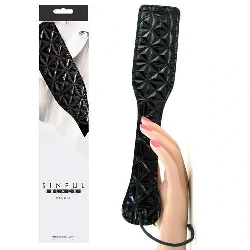 Темный цвет – это сексуальность, поэтому в этой коллекции использован именно полуночный черный. Выпуклая, трехмерная текстура черного винила – очень рельефная и необычная на ощупь. Элементы из настоящей кожи придают фетишиское очарование. Шлепалка Sinful Paddle виниловая черная удобно ложится в руку. Легкая и прочная. Двухстороння шлёпалка идеальный способ познакомиться с удовольствием, получаемым от шлепков. Специальная форма обеспечивает большую площадь покрытия, а длинная ручка упрощает контроль и процесс шлепков. Идеально подходит как для новичков, так и для истинных ценителей. Длина 32 см, ширина 6 см, ширина ручки 3,5 см. Цвет: черный. Материал: винил, кожа.
