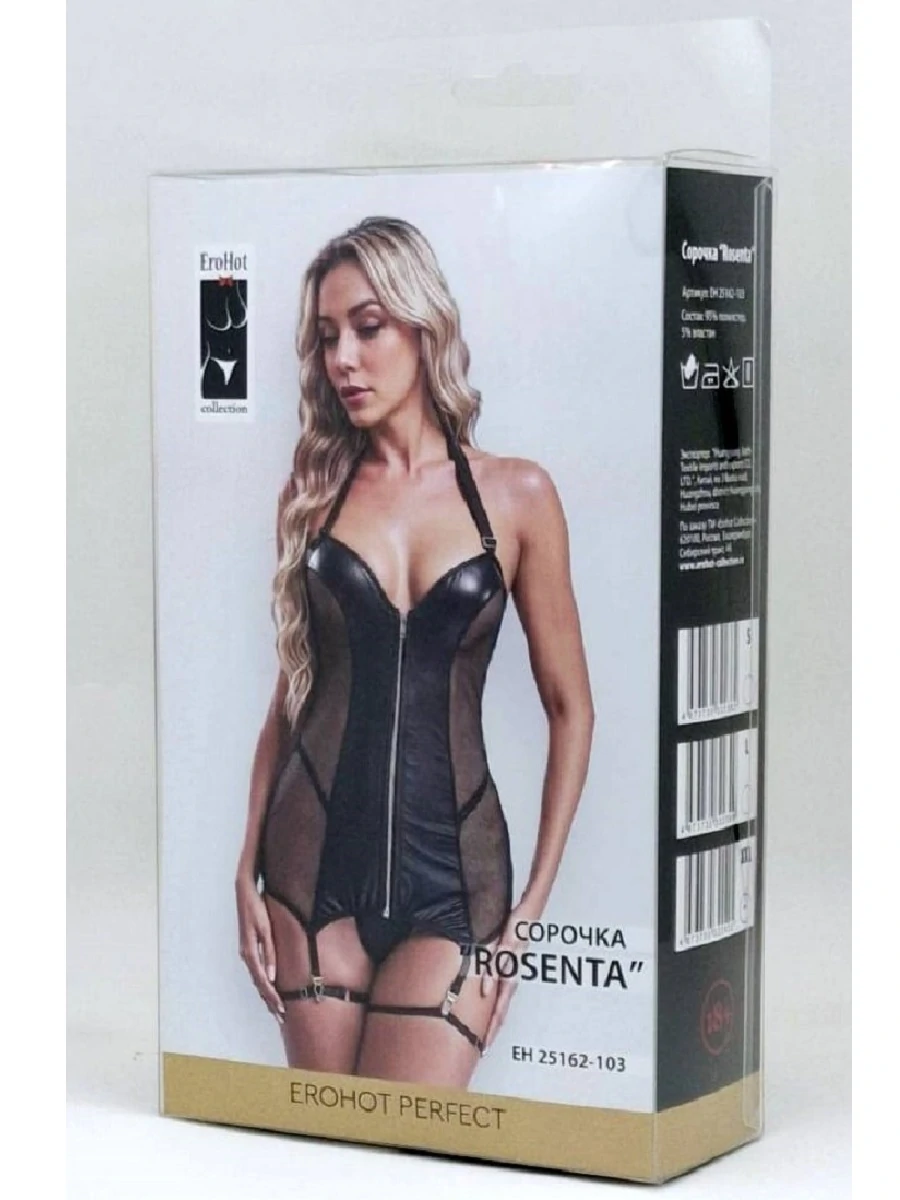 Обольстительная сорочка Rosenta сделает Вас королевой ночи! Изготовлено из мелкой сеточки чёрного цвета со вставкой из ткани Wetlook. Спереди застёгивается на молнию. На шее и спинке сорочка регулируется эластичными лентами. Открытая спинка подчеркнёт хрупкость силуэта. Образ дополняют чулкодержатели золотого цвета, к которым пристёгиваются гартеры из эластичных лент(в комплекте). В комплекте трусики-стринги. Чулки в комплект не входят. Размер L. Цвет: черный.