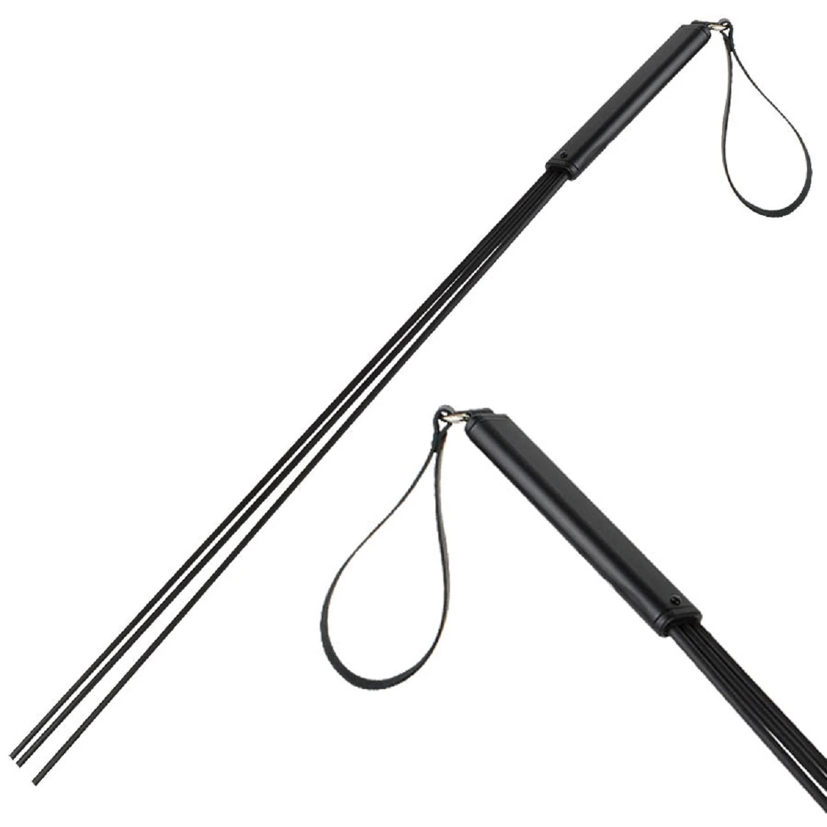 Стек розги состоит из металлической вороненой рукояти и 3-х полимерных хлыстов, покрытых натуральным латексом. Общая длина 62см. Цвет черный