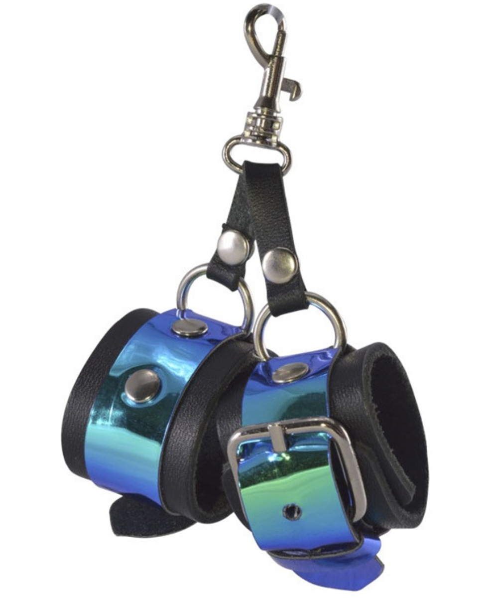 Оригинальный и забавный сувенир-подвеска – это миниатюрное изделие в форме наручников. Подвеска изготовлена из натуральной кожи и украшена лентой из искусственной кожи цвета хамелеон. Необычные «наручники BDSM» может служить автомобильной подвеской, украшением для сумки, а так же приятным презентом для Ваших друзей и знакомых. Общая длина около 14 см, ширина - 2,8 см. Цвет черный.