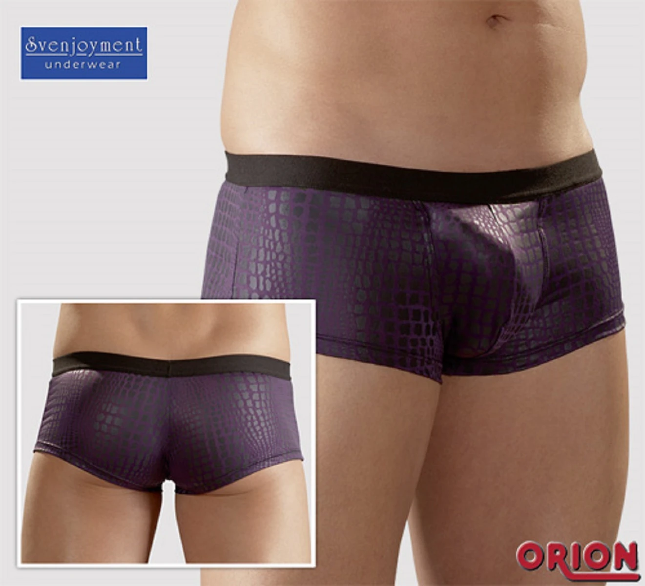 Мужские боксеры с отверстием внутри, благодаря которому создается эффект выпуклости. Эффектная ткань под крокодиловую кожу.