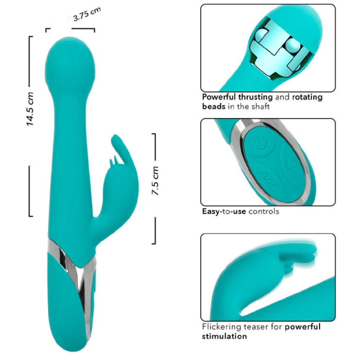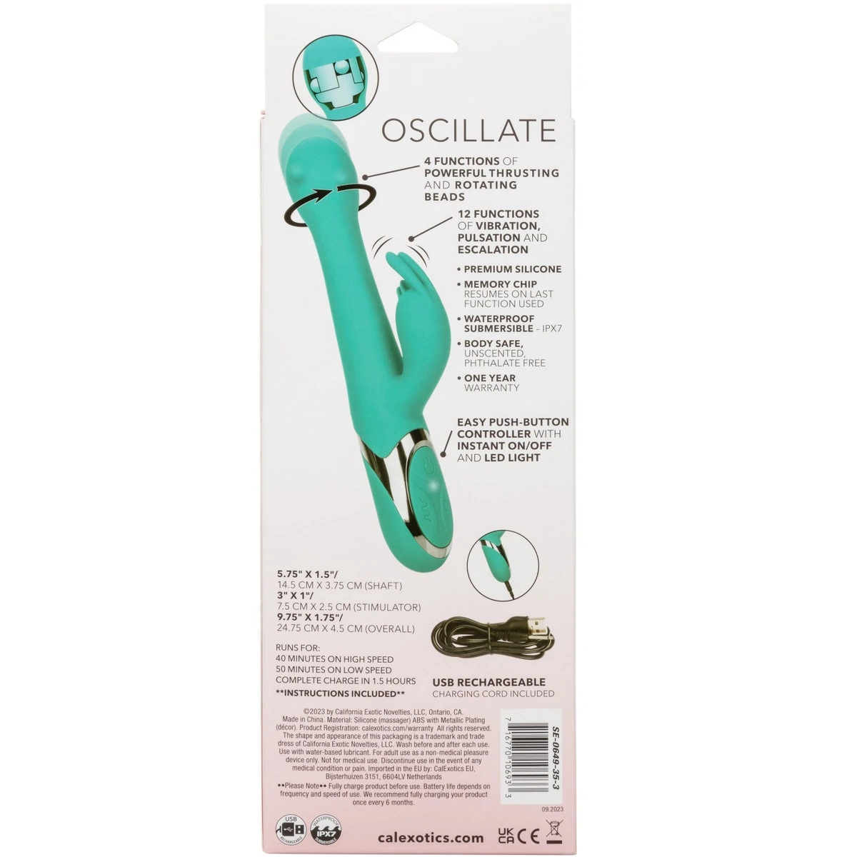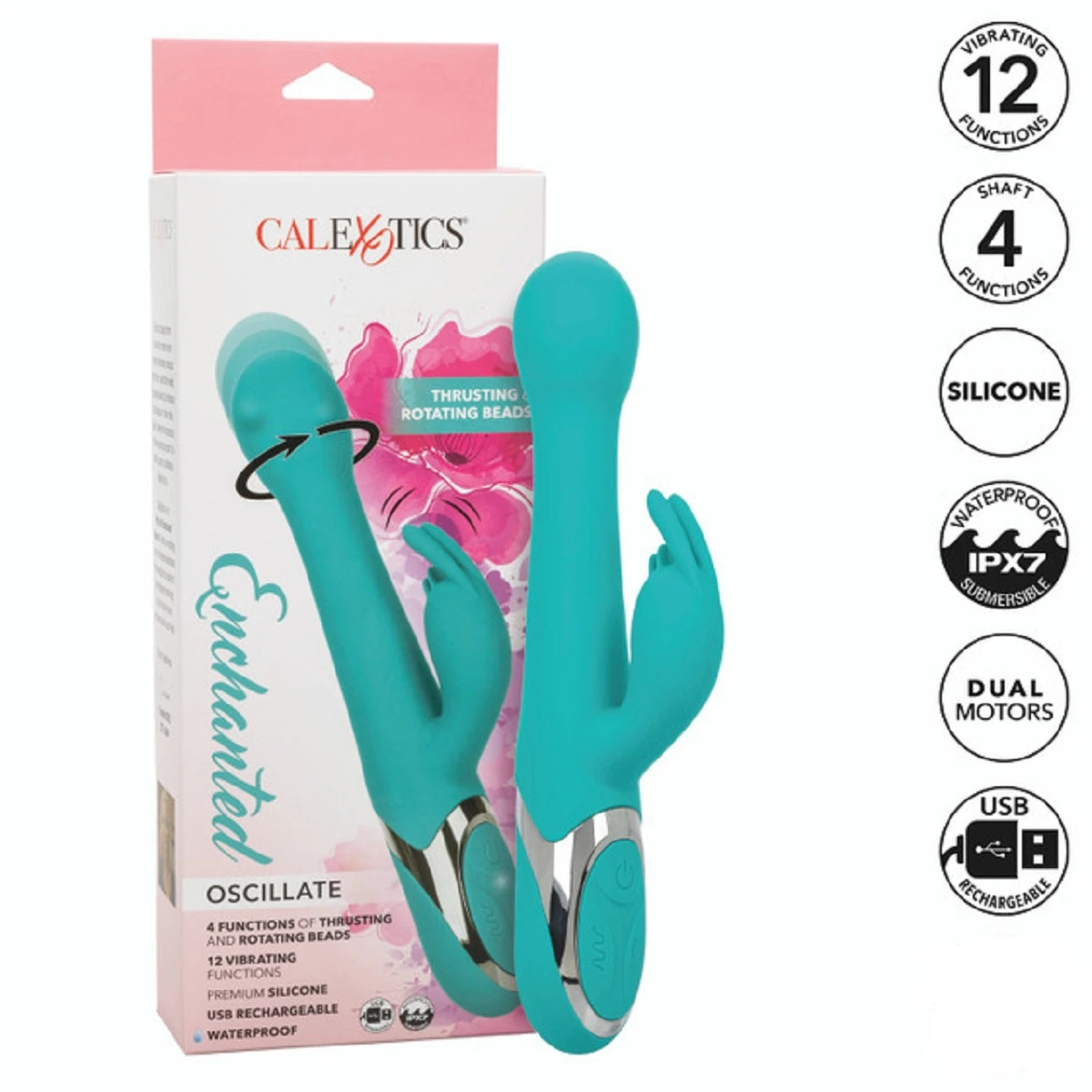 Enchanted Oscillate – перезаряжаемый вибромассажер с клиторальным отростком. Изготовлен из бесшовного, гипоаллергенного, безопасного для тела, не содержащего фталатов силикона премиум-класса. Два мощных мотора обеспечивает 12 интенсивных режимов вибрации, на головке 4 функции пенетрации и вращения бусин. Девайс снабжен высокотехнологичным чипом памяти, который позволяет запомнить последний режим выбранной вибрации и включается именно с него, не требуя снова искать предпочитаемую функцию. Вибромассажер заряжается через USB и может быть подключен практически в любом месте, просто подсоедините идущий в комплекте шнур к совместимому порту компьютера или USB-адаптера (приобретается отдельно), а противоположный конец со штекером к игрушке. Размер: общая длина 24 см, длина рабочей части 14 см, длина клиторального отростка 7,5 см, диаметр 3,75 см. Цвет бирюзовый. Для более комфортного использования рекомендуем приобрести смазку на водной основе и очищающий спрей Clear Toy 100 мл для обработки изделия.