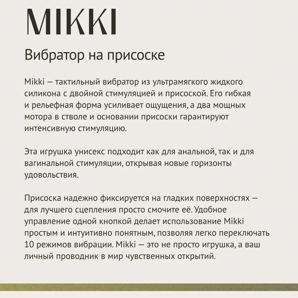 Mikki — Тактильный вибратор из премиум жидкого силикона с двойной стимуляцией и присоской это идеальный выбор для глубокого и разнообразного удовольствия, выполненный из ультра мягкого жидкого силикона.Его гибкая и рельефная форма усиливает ощущения, а два мощных мотора в стволе и основании присоски гарантируют интенсивную стимуляцию. Эта игрушка унисекс подходит как для анальной, так и для вагинальной стимуляции, открывая новые горизонты удовольствия. Присоска надежно фиксируется на гладких поверхностях. Удобное управление одной кнопкой делает использование Mikki простым и интуитивно понятным, позволяя легко переключать 10 режимов вибрации: зажмите кнопку на 3 секунды для активации. После включения игрушка выполнит короткую вибрацию, сигнализируя о готовности к работе. Размер: общая длина 13 см, рабочая длина 12 см, диаметр 2,5 см. Цвет: телесный. Для более комфортного использования рекомендуем приобрести смазку на водной основе и очищающий спрей Clear Toy 100 мл для обработки изделия.