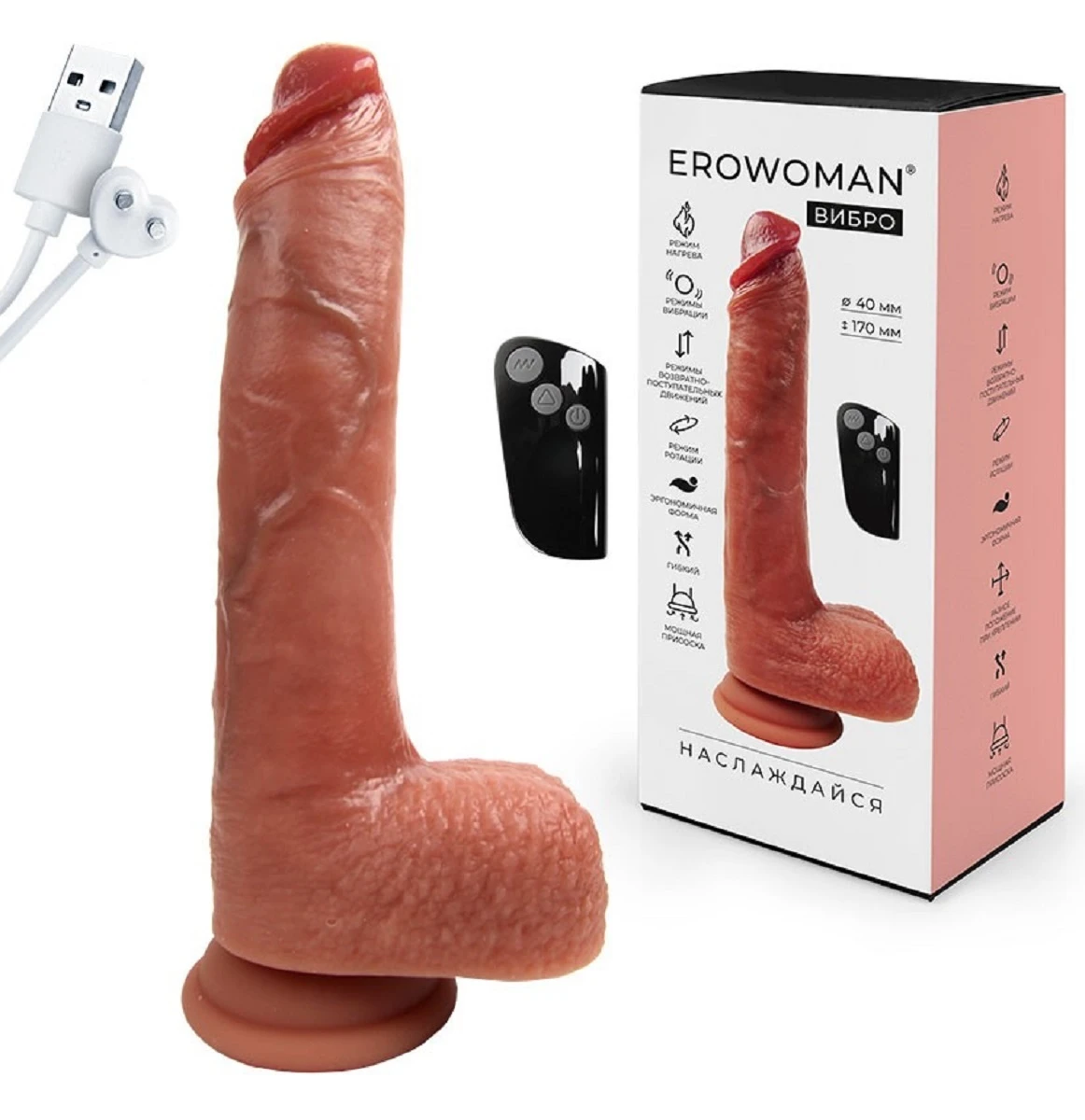 Роскошный вибромассажёр для разнообразных эротических удовольствий. Форма в виде пениса, естественный оттенок поверхности, ярко выраженные венки и складочки, хорошо очерченные головка и мошонка придают секс-игрушке максимальной реалистичности. Вибрация, разные режимы ротации и возвратно-поступательных движений, нагрев, мягкая головка, приятный на ощупь материал усиливают возбуждение и доводят до пика наслаждения. Присоска надёжно удерживает изделие на ровной горизонтальной или вертикальной поверхности. Для управления работой эротического аксессуара с помощью пульта, необходимо сначала нажать кнопку включения/выключения на его корпусе, а затем использовать кнопки на самом пульте. В комплект входит USB провод для зарядки изделия, дистанционный пульт, батарейка для пульта. Размер: общая длина 22 см, рабочая длина 17 см, диаметр 4 см. Цвет телесный. Для более комфортного использования рекомендуем приобрести смазку на водной основе и очищающий спрей Clear Toy 100 мл для обработки изделия.