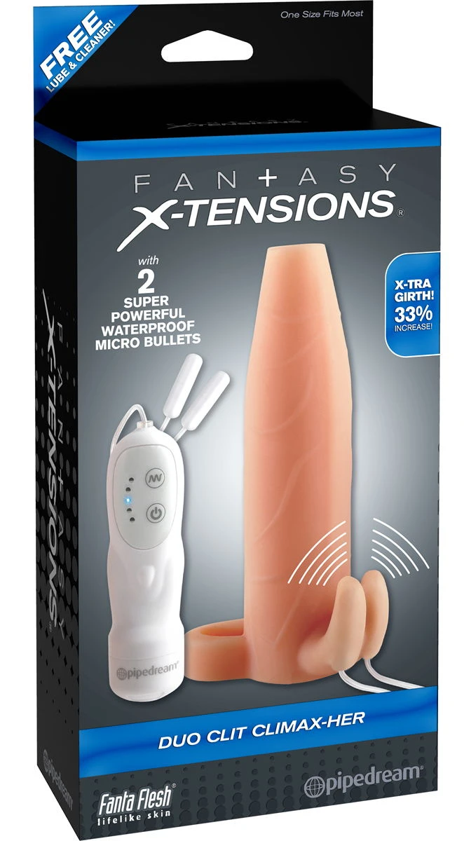 Вибронасадка изготовлена из супер-эластичного Fanta Flesh материала. Подходит для большинства размеров. Насадка увеличивает диаметр (даёт в среднем 33% увеличения в диаметре от исходных параметров). Легко обрезается на кончике для идеальной подгонки под индивидуальные параметры. Кольцо у основания насадки надевается на мошонку для пролонгации полового акта и способствует удержанию насадки на месте. У основания насадки, в верхней части, имеются ушки для вибростимуляции клитора. Диаметр внутренний 3 см. Насадка многопрограммная и мультискоростная, с двумя мощными водонепроницаемыми вибропулями, работает от проводного дистанционного пульта. В комплект включены: 2 мощные микропули, пульт ДУ, любрикант, очиститель для игрушек. Батарейки в комплект не включены.
