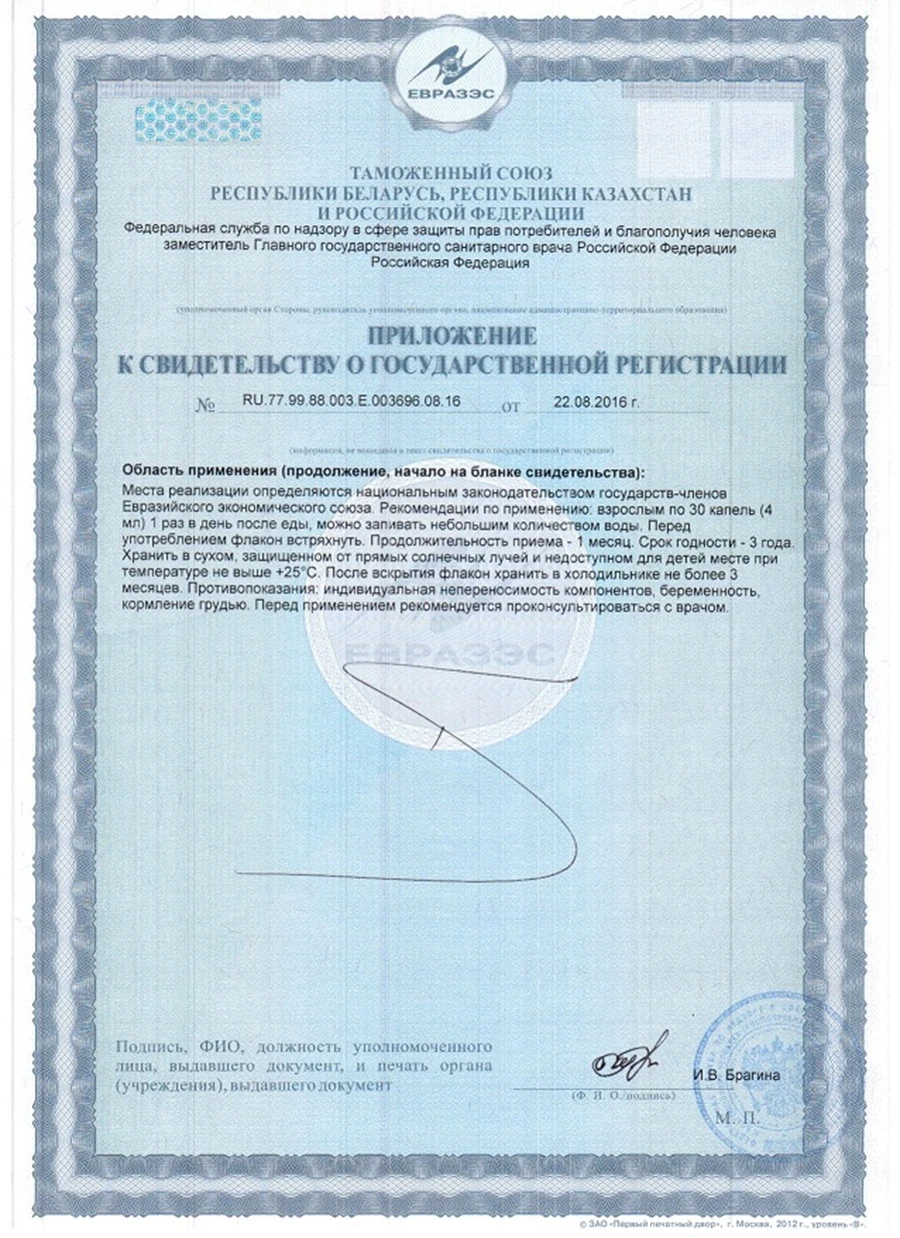 Принимать 30 - 40 капель (4 мл) за 30-40 мин до встречи, перед употреблением взболтать. Можно добавить в любую жидкость, не рекомендуется в чай/кофе, совместимо с алкоголем.