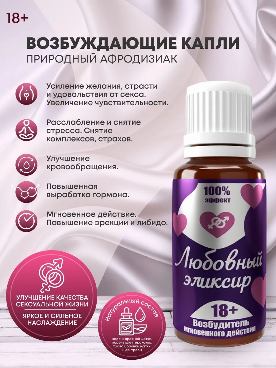 Иногда для жаркого секса не хватает лишь пары капель любовного эликсира. Это легендарный продукт, в состав которого, входят ингредиенты, издавна славившиеся как лучший стимулятор сексуального желания. Эликсир любви обогащен афродизиаками и экстрактами, которые стимулируют ваши желания и вызывают жажду секса. Эликсир поможет паре достичь невероятных сексуальных результатов – значительно повышает возбудимость обоих партнеров, ночь с применением этих капель будет незабываемой! Способ применения: 10-15 капель растворить в жидкости за 10-20 минут до секса. Эликсир не является лекарственным средством, возможны побочные действия.