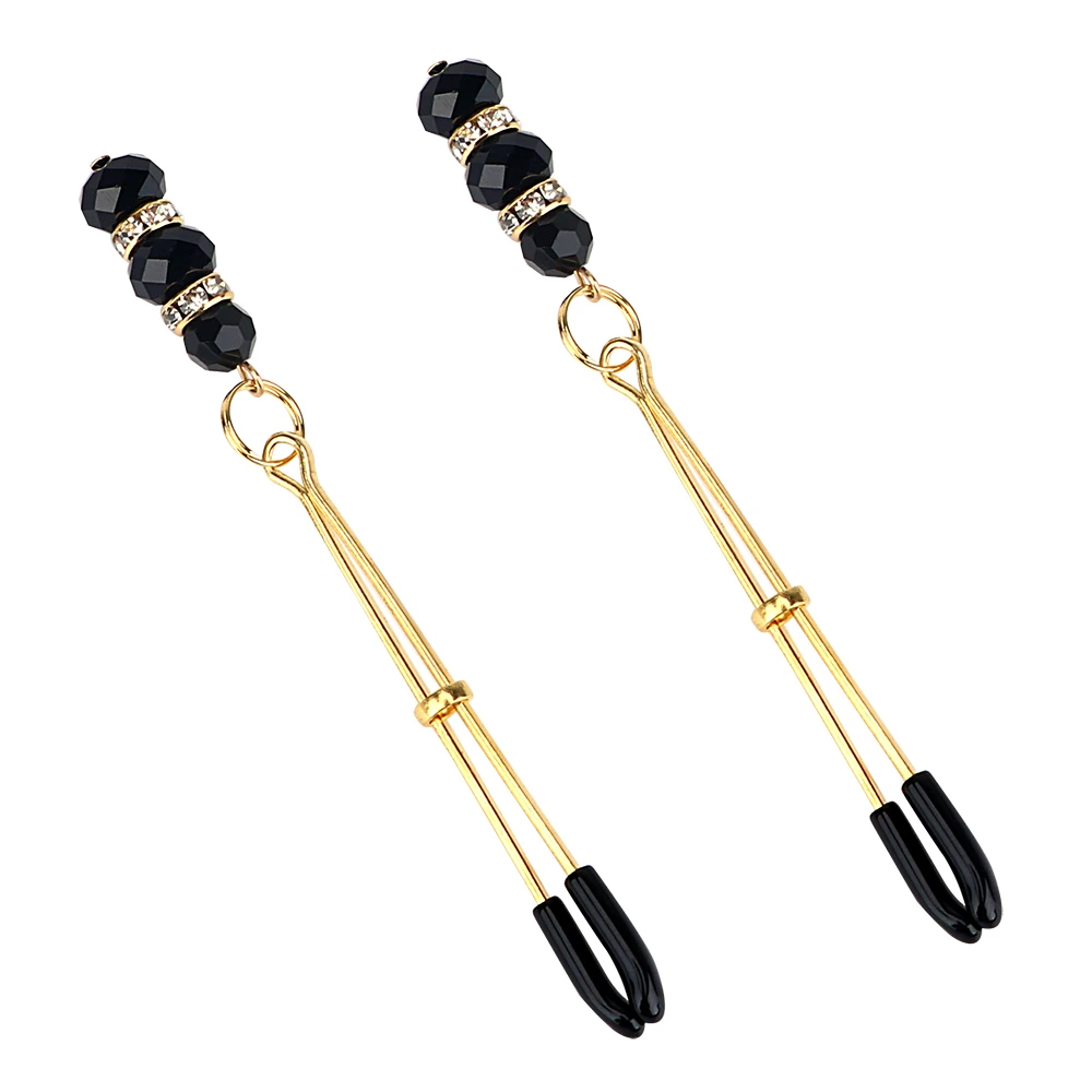 Украшение в виде зажимов золотистого цвета с черными бусинками стимулируют соски и подчёркивают сексуальность. Оборудованы резиновыми наконечниками и регуляторами давления нажима,что позволит контролировать боль. Размер: длина 10 см.