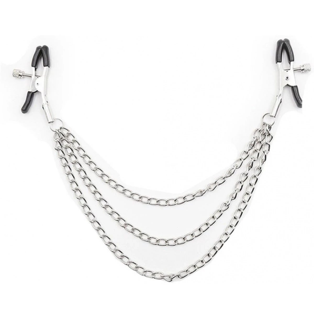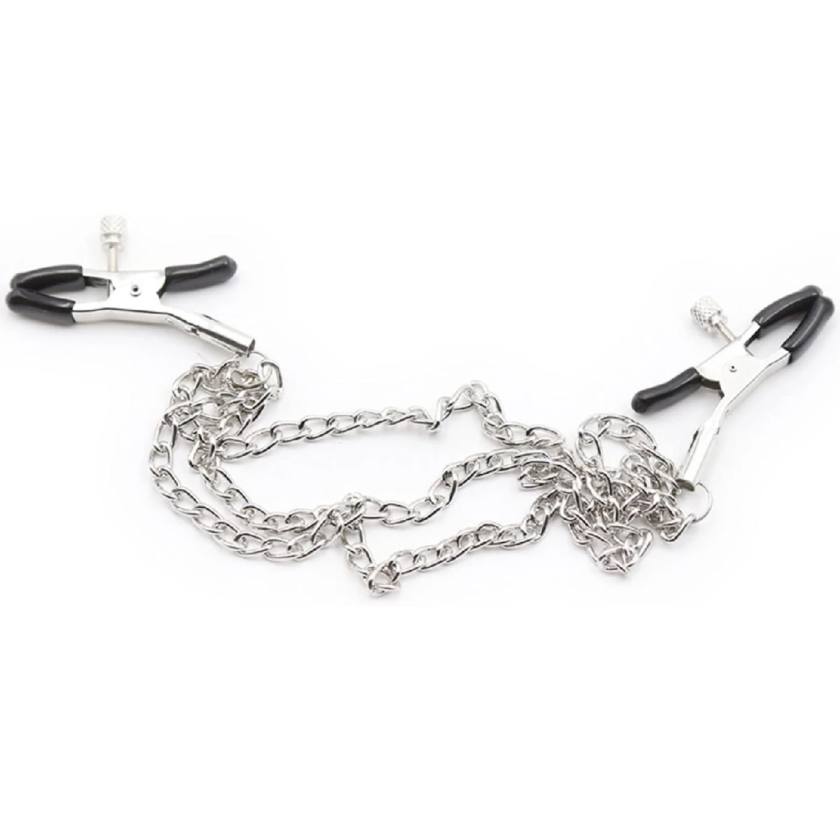 Изящные аксессуары для стимуляции сосков и усиления сексуального возбуждения. Зажимы на соски со специальным резиновым покрытием и с винтиками для регулировки силы давления. Зажимы соединены между собой 3-мя металлическими цепочками. Интимные аксессуары могут использоваться соло или для парных любовных игр. Материал: металл. До и после использования зажимы рекомендуется обработать очищающим спреем с антимикробным эффектом Clear Toy.