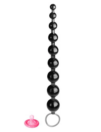 Отличное чувственное развлечение для любителей анальных удовольствий - целых десять шариков переменного диаметра, соединенных в общую прочную цепь, с удобным кольцом для извлечения. Легко вводятся в анус благодаря постепенному увеличению диаметра шариков. Вызывают у обоих партнеров новые приятные ощущения, не испытанные раньше... Если в момент оргазма начать постепенно извлекать их из ануса, то оргазм обретет новую остроту, будет сильнее и продолжительнее! Размер: длина 25,5 см, диаметр 0,5 - 2 см. Материал: гель. Для более комфортного использования рекомендуем приобрести смазку на водной основе и очищающий спрей Clear Toy 100 мл для обработки изделия. Цвет: черный.