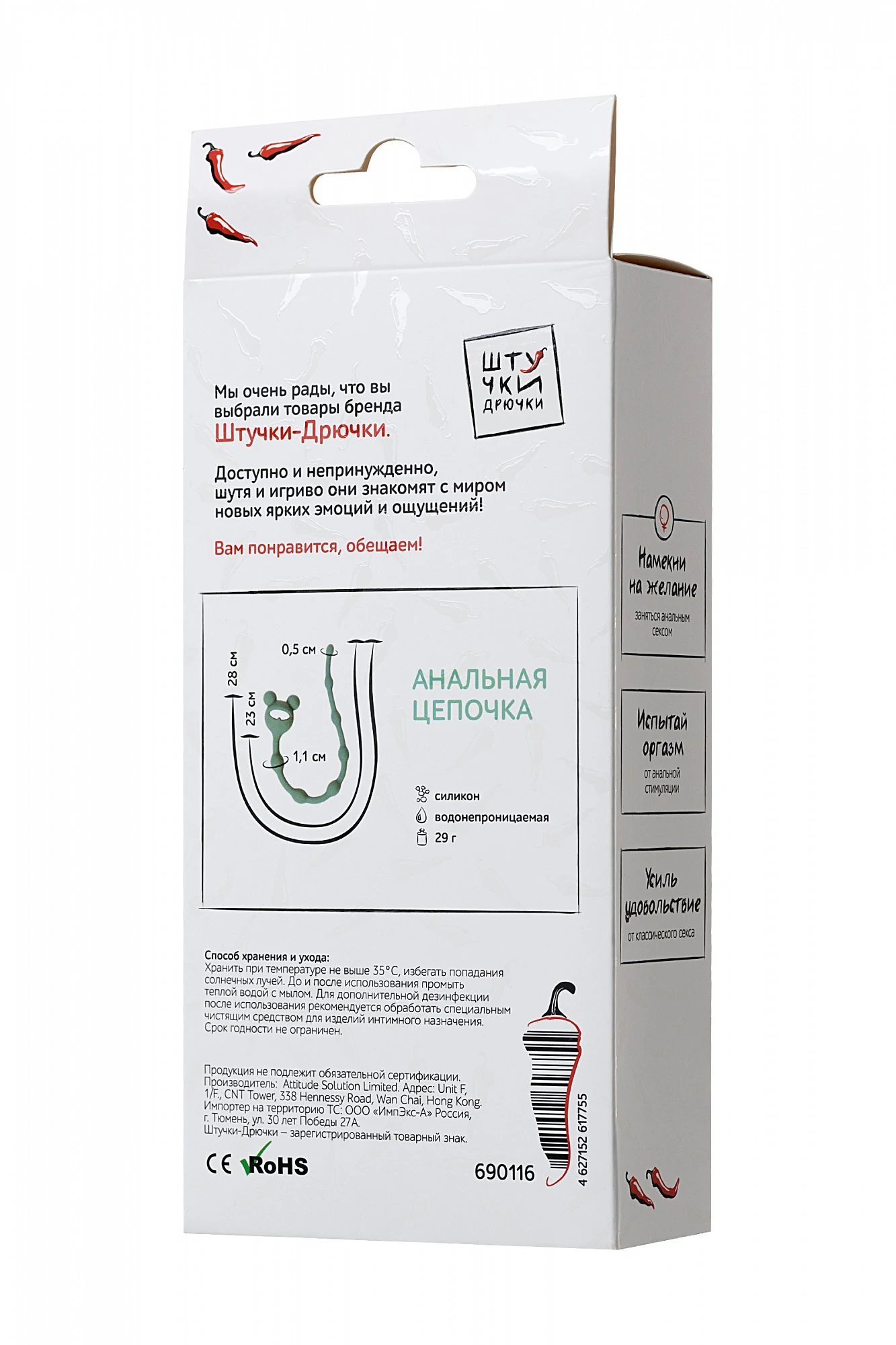 Эта анальная цепочка создана для непередаваемых эмоций во время интимной близости. Длина цепочки за счет разделительных звеньев не напугает новичка и порадует опытного любителя пикантных ощущений. Ожерелье постепенно увеличивающихся в диаметре горошин приятно массирует и дарит совершенно особенное удовольствие. За счет элегантного хвостика-ушастика его комфортно вводить и извлекать без всяких затруднений. С анальной цепочкой легко усилить удовольствие и вывести сексуальные отношения на новый уровень. Размер: Общая длина 28 см, рабочая длина 23 см, диаметр 0,5 – 1,1 см. Для более комфортного использования рекомендуем приобрести смазку на водной основе и очищающий спрей Clear Toy 100 мл для обработки изделия.