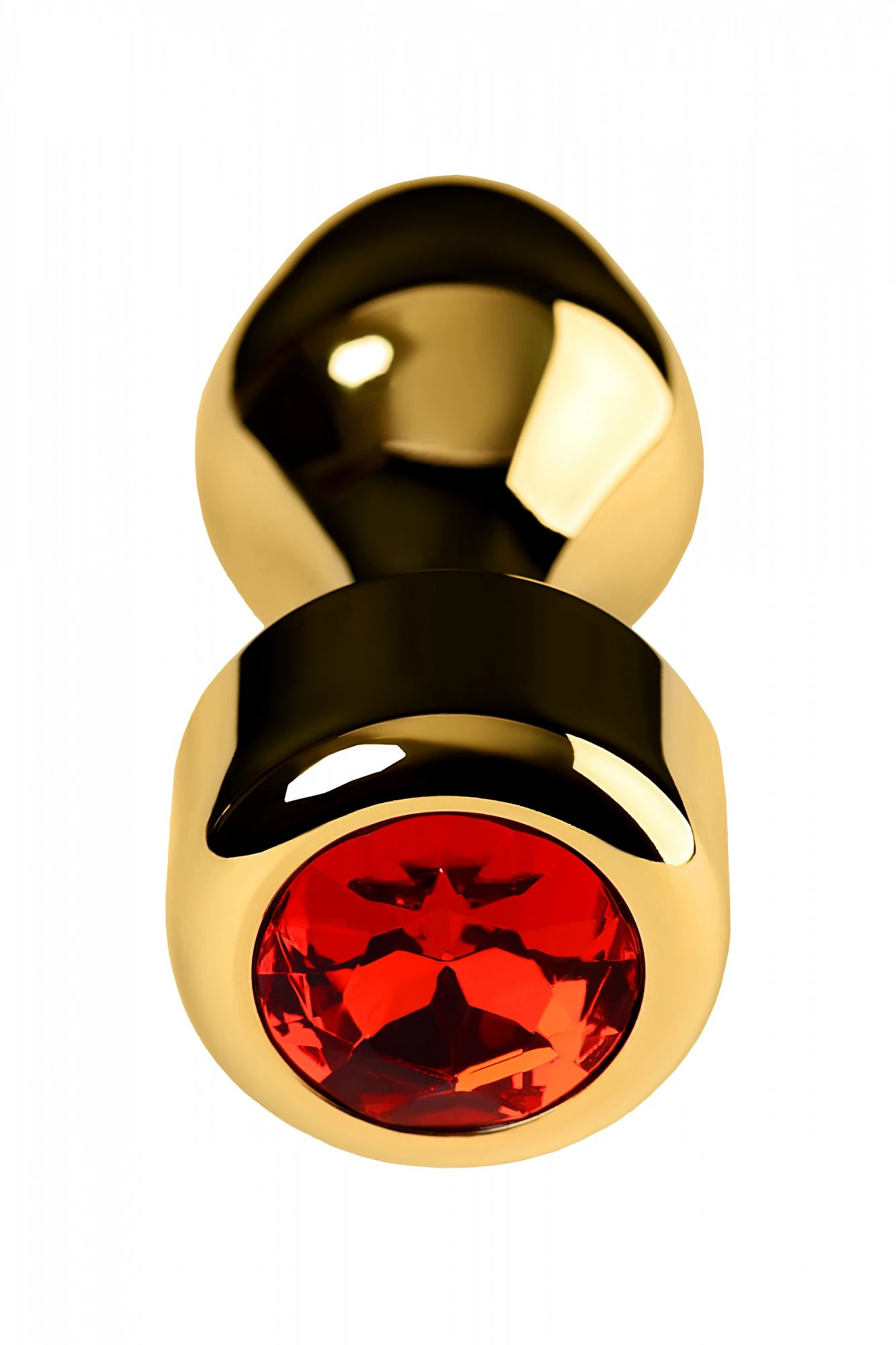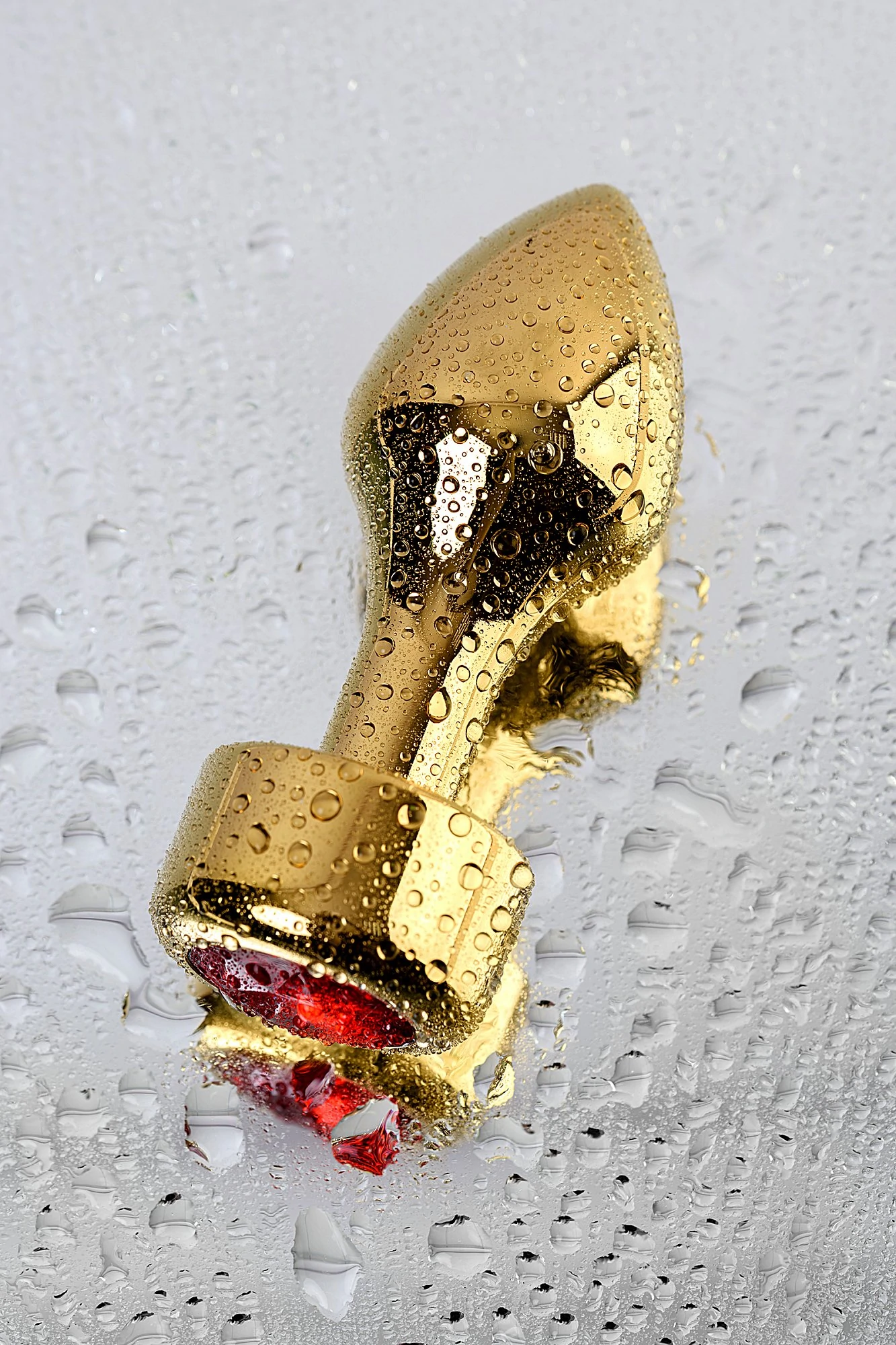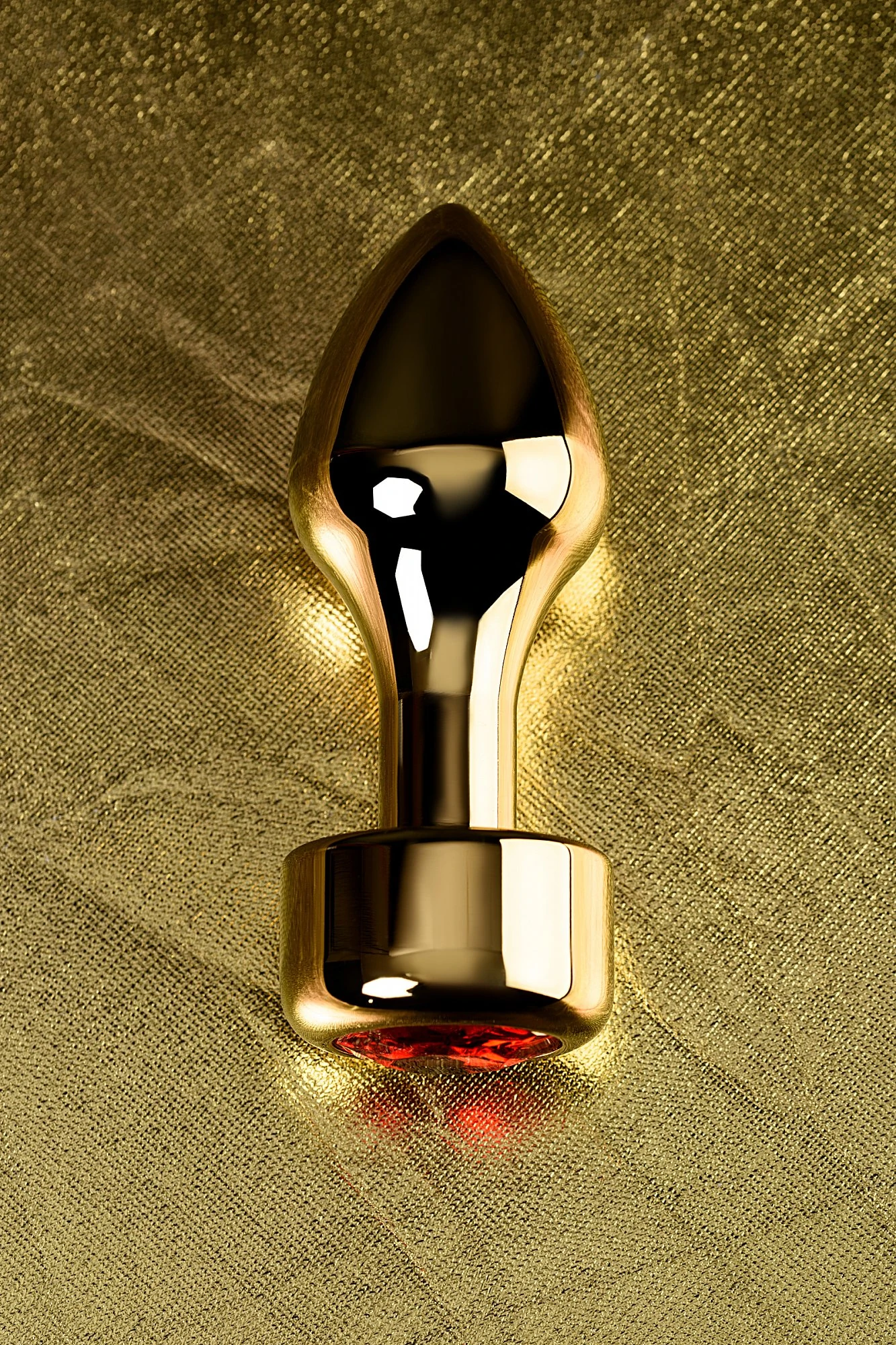 Анальная втулка металл, золотая, с красным кристаллом. Удобно вводится и удерживается внутри. Широкий ограничитель добавляет уверенности в том, что она не войдет слишком глубоко. Размер: общая длина 10.8 см, рабочая длина 8.5 см, диаметр 4 см. Вес 200 гр.