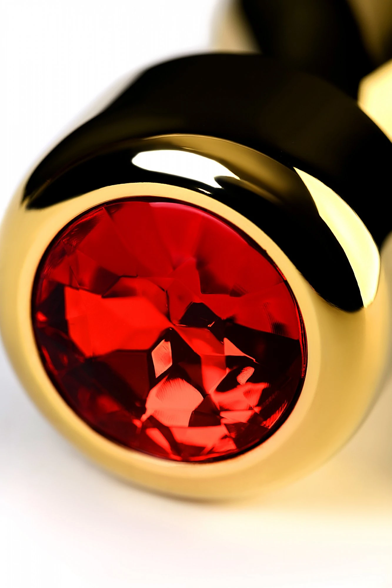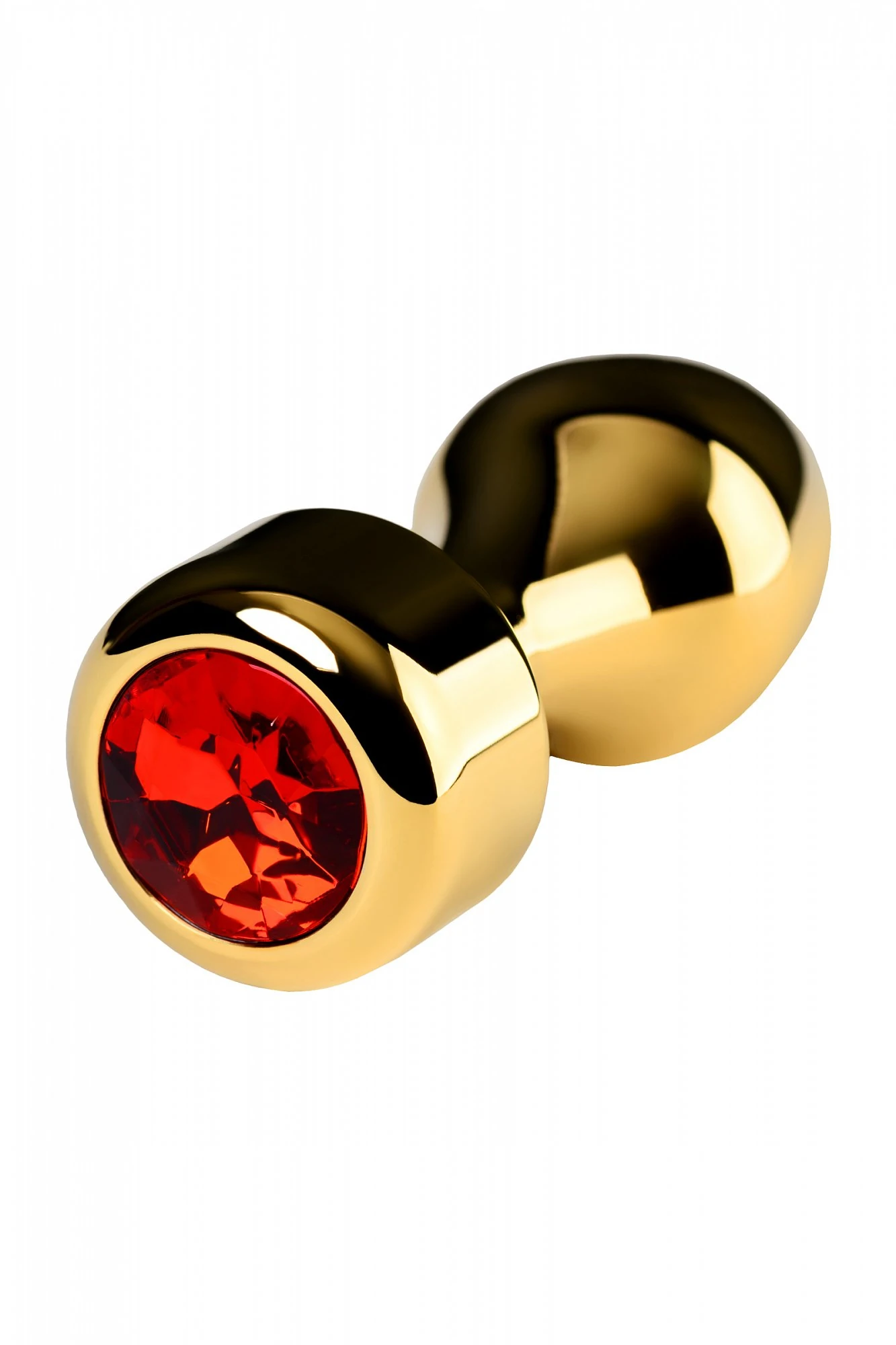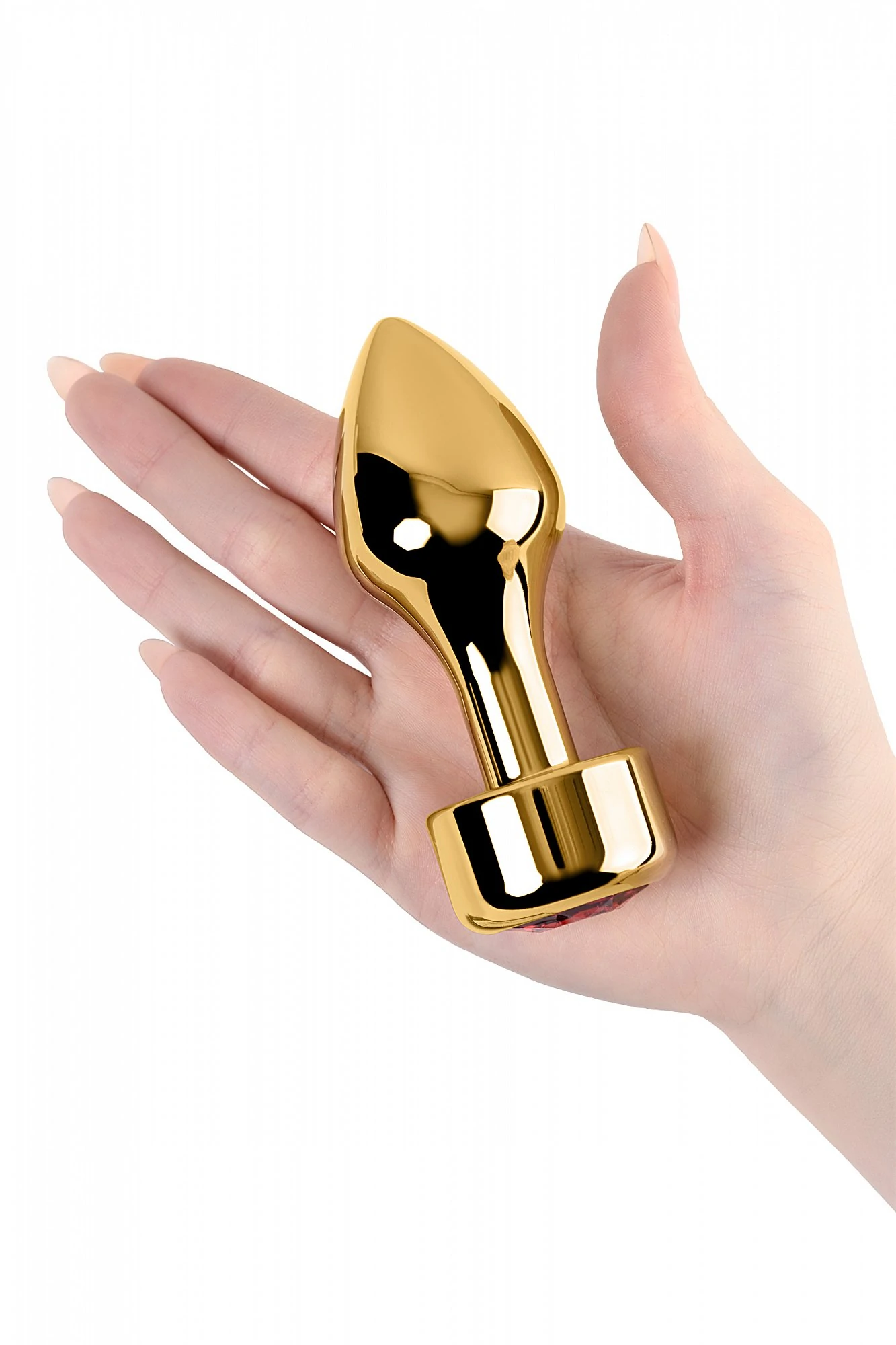 Анальная втулка металл, золотая, с красным кристаллом. Удобно вводится и удерживается внутри. Широкий ограничитель добавляет уверенности в том, что она не войдет слишком глубоко. Размер: общая длина 10.8 см, рабочая длина 8.5 см, диаметр 4 см. Вес 200 гр.