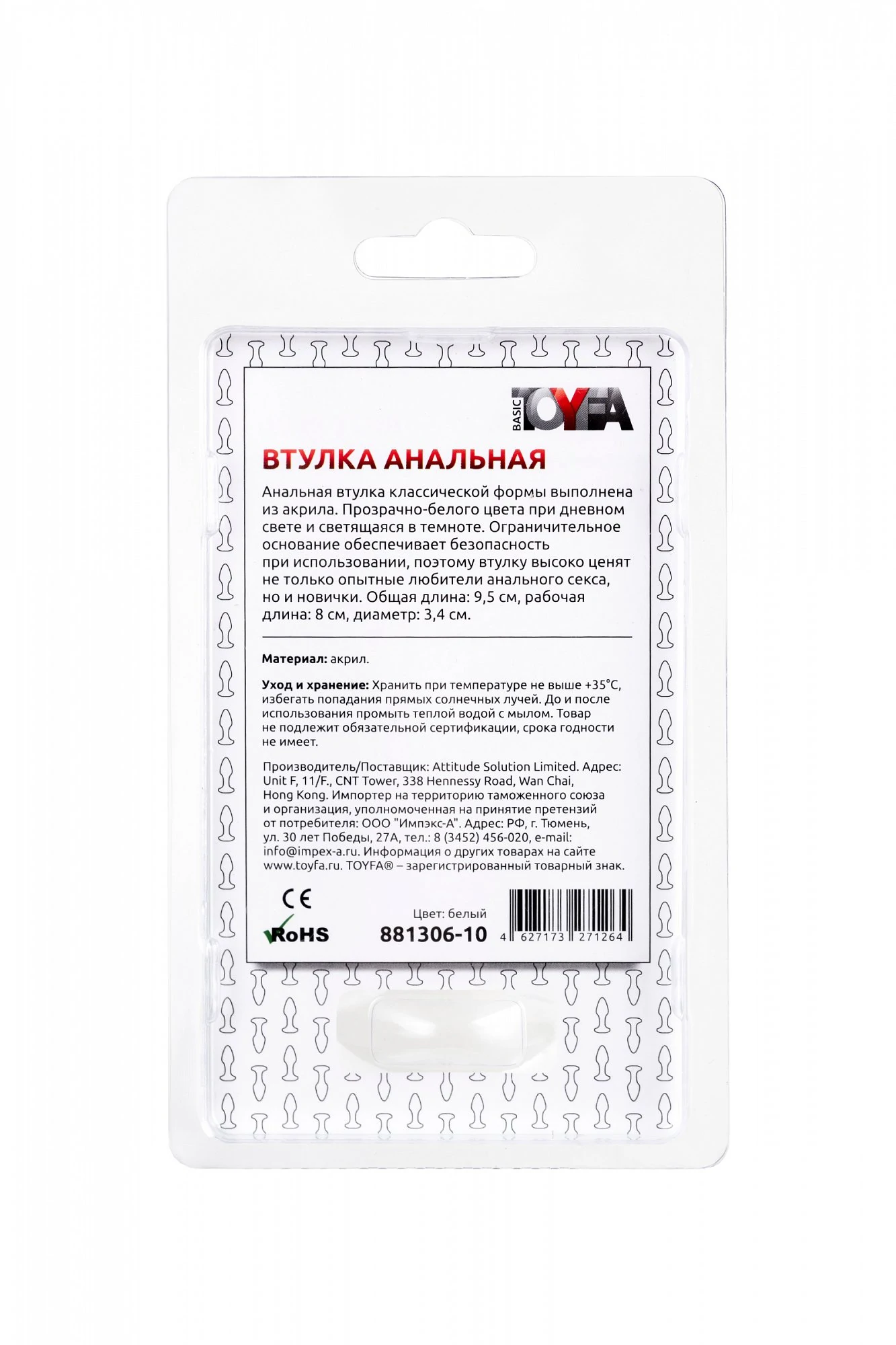 Анальная втулка классической формы выполнена из акрила. Прозрачно-белого цвета при дневном свете и светящаяся в темноте. Ограничительное основание обеспечивает безопасность при использовании, поэтому втулку высоко ценят не только опытные любители анального секса, но и новички.Размер: общая длина 9,5 см, рабочая длина 8 см, диаметр 3,4 см. Для более комфортного использования рекомендуем приобрести смазку на водной основе и очищающий спрей Clear Toy 100 мл для обработки изделия.