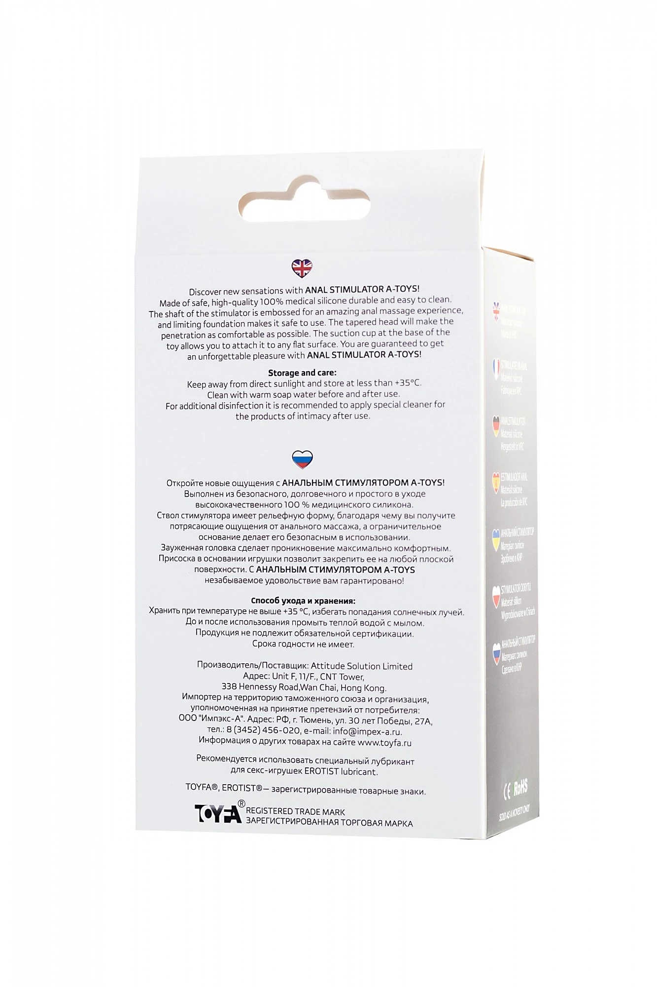 Выполнен из безопасного, долговечного и простого в уходе высококачественного 100 % медицинского силикона. Ствол стимулятора имеет рельефную форму, благодаря чему вы получите потрясающие ощущения от анального массажа, а ограничительное основание делает ее безопасной в использовании. Зауженная головка сделает проникновение максимально комфортным. Присоска в основании игрушки позволит закрепить ее на любой плоской поверхности. С анальным стимулятором A-Toys незабываемое удовольствие вам гарантировано! Размер: Общая длина – 14 см. Рабочая длина – 11,5 см. Макс. диаметр – 3,1 см. Для более комфортного использования рекомендуем приобрести смазку на водной или силиконовой основе и очищающий спрей Clear Toy 100 мл для обработки изделия.