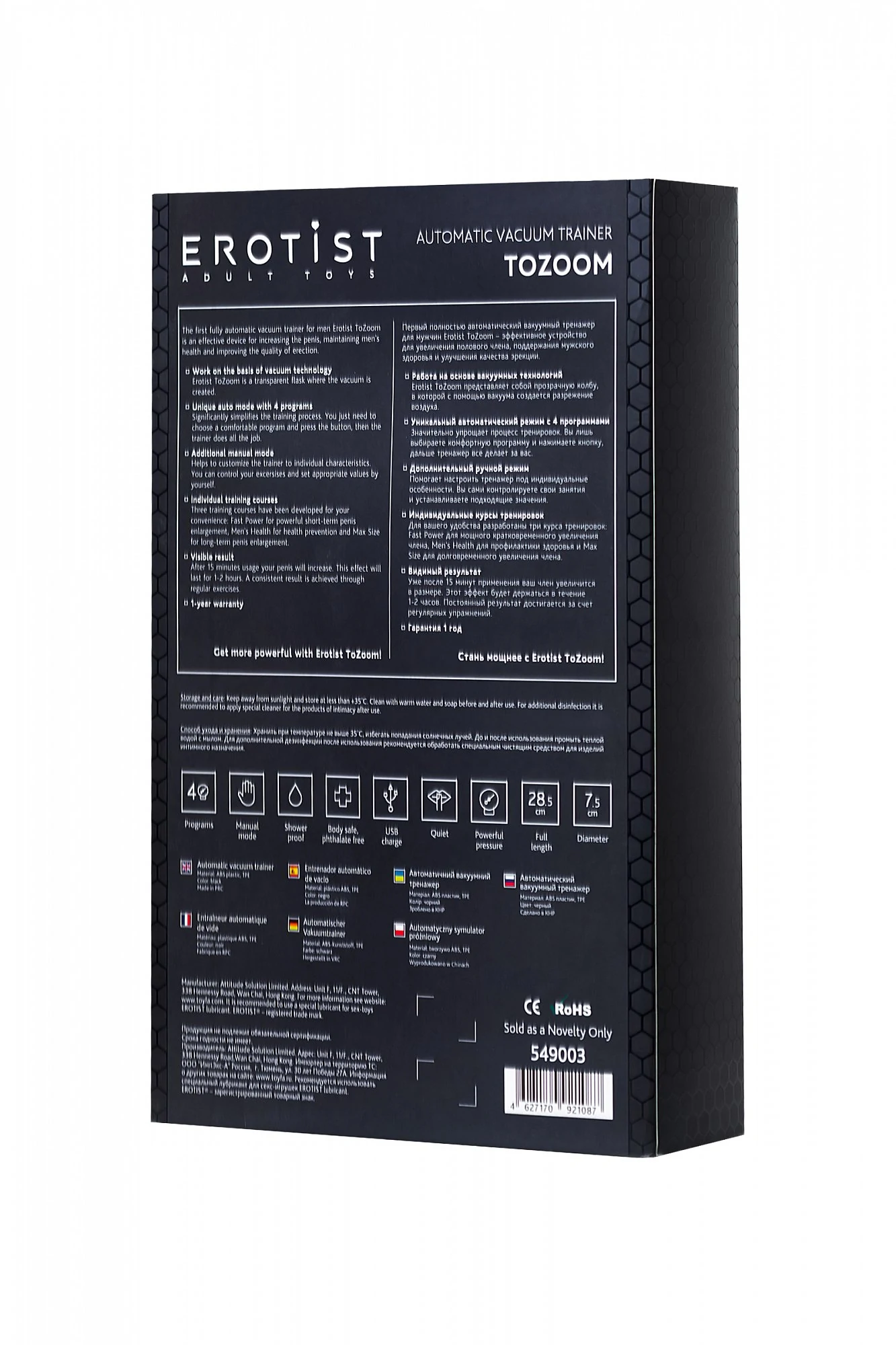 Первый полностью автоматический вакуумный тренажер для мужчин Erotist ToZoom — эффективное устройство для увеличения полового члена, поддержания мужского здоровья и улучшения качества эрекции. Работа на основе вакуумных технологий. Erotist ToZoom представляет собой прозрачную колбу, в которой с помощью вакуума создается разрежение воздуха. Уникальный автоматический режим с 4 программами. Значительно упрощает процесс тренировок. Вы лишь выбираете комфортную программу и нажимаете кнопку, дальше тренажер все делает за вас. Дополнительный ручной режим. Помогает настроить тренажер под индивидуальные особенности. Вы сами контролируете свои занятия и устанавливаете подходящие значения. Индивидуальные курсы тренировок. Для вашего удобства разработаны три курса тренировок: Fast Power для мощного кратковременного увеличения члена, Men's Health для профилактики здоровья и Max Size для долговременного увеличения члена. Видимый результат. Уже после 15 минут применения ваш член увеличится в размере.