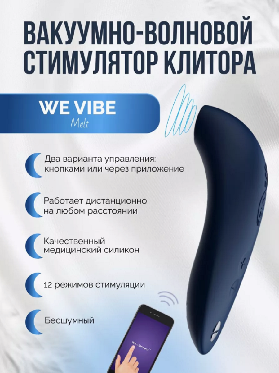 We-Vibe Melt – вакуумно-волновой стимулятор для клитора, с запатентованной технологией воздействия. Массажер имеет возможность создания уникальных «плейлистов» стимуляции и управление на любом расстоянии, из любой точки мира.